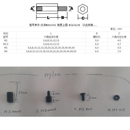 Size For example: M3 * 10 + 6 said: thread diameter of 3 mm, hexagonal height of 10 mm, the length of 6 mm