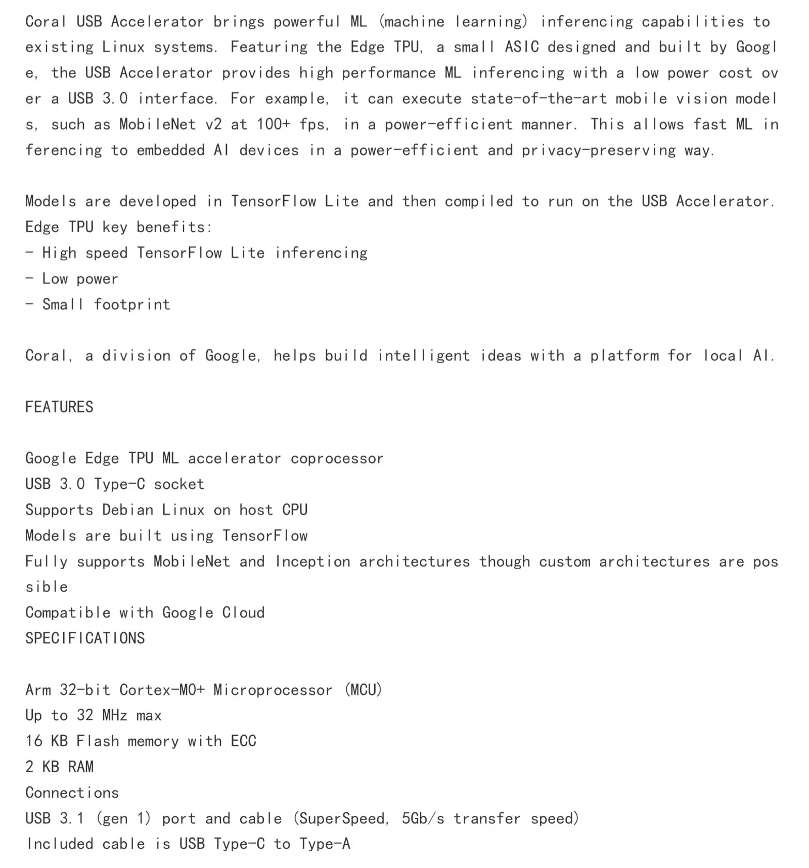 The Coral USB Accelerator adds an Edge TPU coprocessor to your system, enabling high-speed machine learning inferencing on a wide range of systems, simply by connecting it to a USB port.