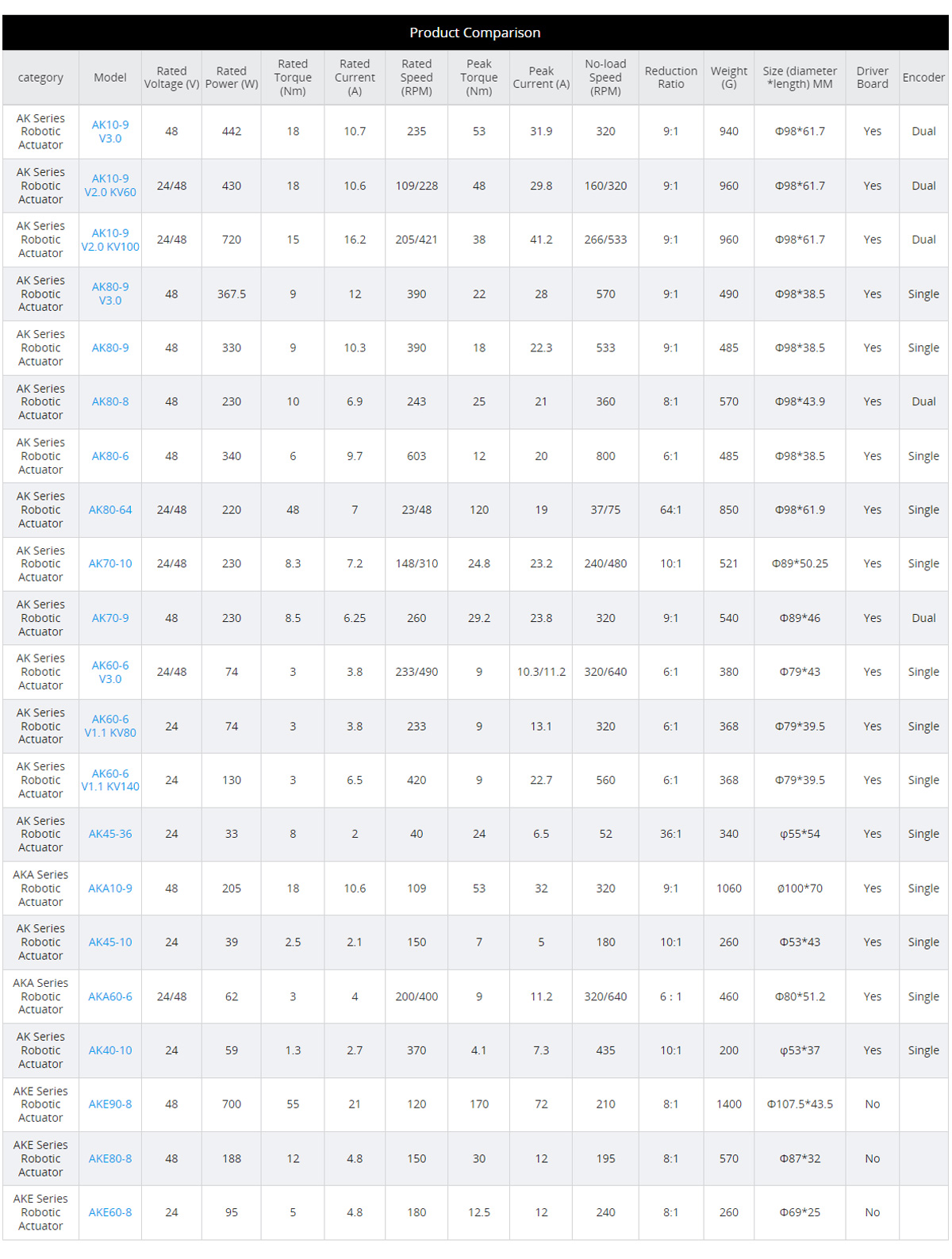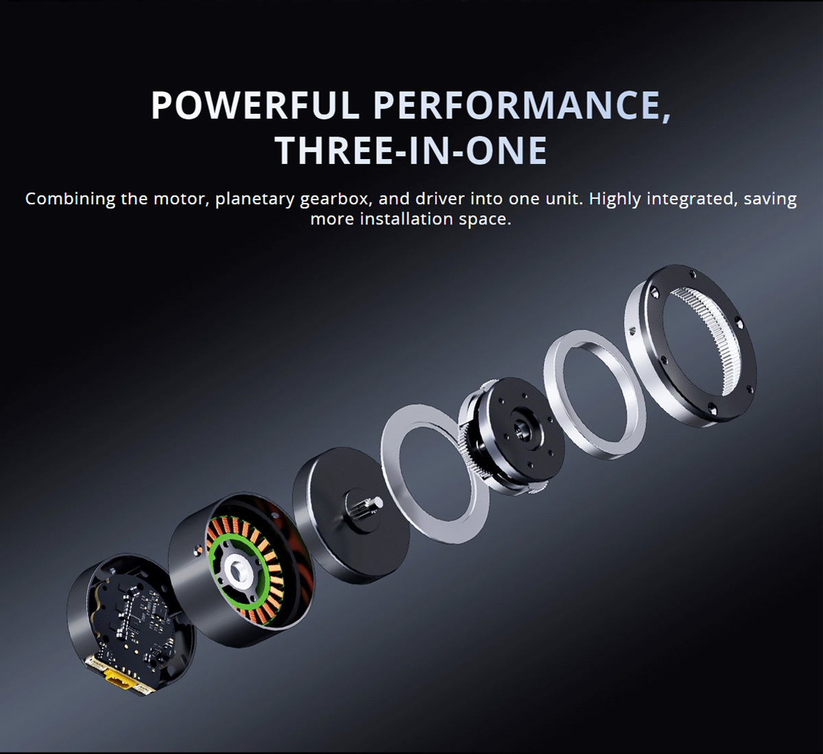 The AK40-10, AK45-10, and AK45-36 series are high-performance power modules that integrate a brushless motor, planetary gearbox, and driver into a single unit, providing the perfect solution for powerful motion and precise control. These modules feature a lightweight design with high efficiency and strong power, offering exceptional torque density to meet various high-load demands. The core components of the gearbox and the manufacturing process have been specially optimized to deliver a smoother operating experience. Supporting both servo and motion control modes, they incorporate adaptive PID settings, eliminating complexity and enabling direct, efficient operation.