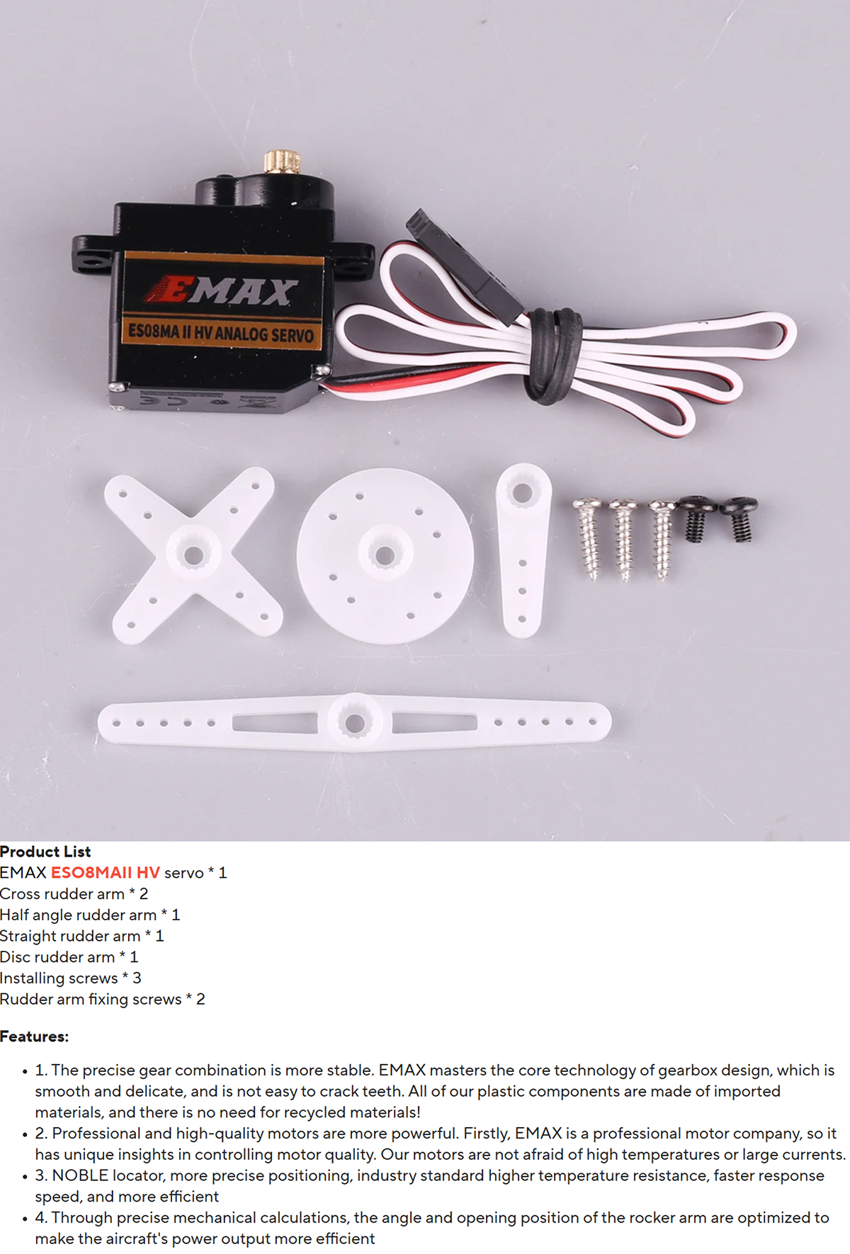 The precise gear combination is more stable. EMAX masters the core technology of gearbox design, which is smooth and delicate, and is not easy to crack teeth. All of our plastic components are made of imported materials, and there is no need for recycled materials!