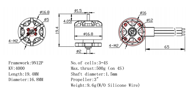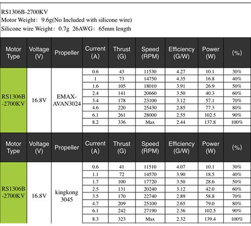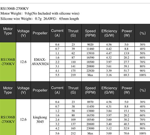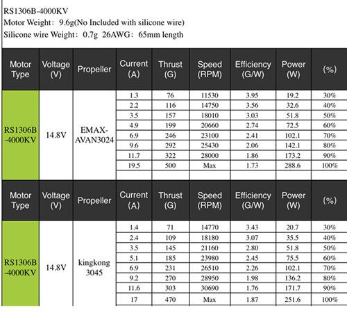 Max thrust: 4000kv-500g(on 4s), 2700kv-336g(on 4s)