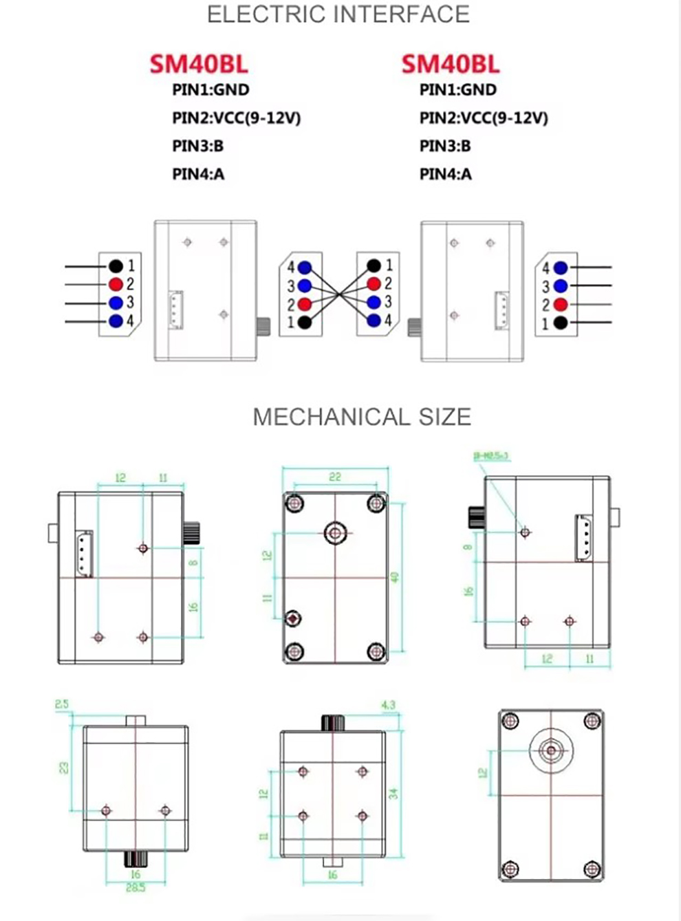 The communication instruction set of SM40BL is completely open, and the servo communicates with the host computer through the asynchronous serial interface. The SM40BL can be set to either the motor mode or the position control mode by sending commands through the asynchronous serial interface.