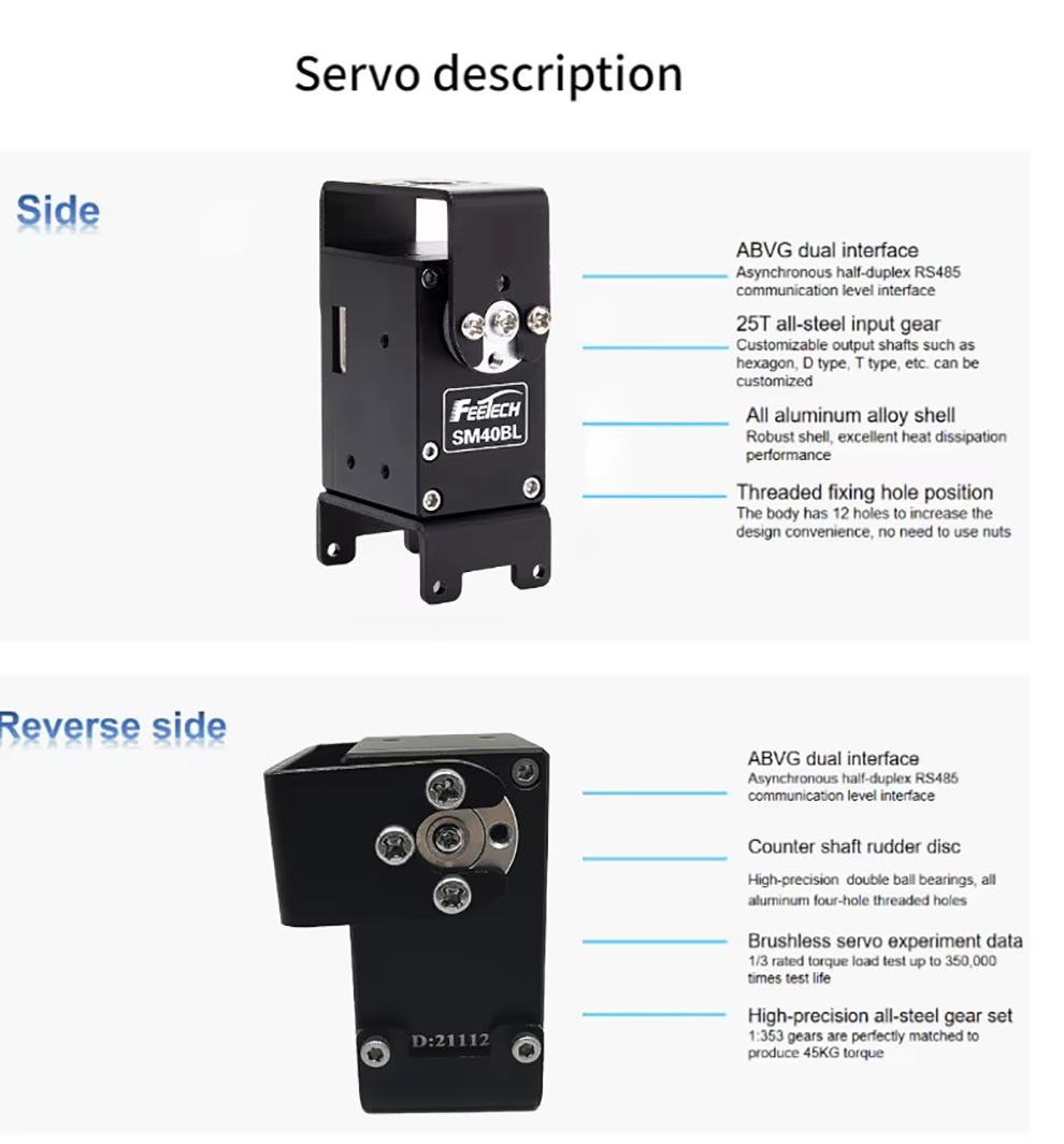 SM40BL has serial bus interface, the 254 robot servo can form a chain through the bus. Each servo can be set with different node addresses, multiple servo wheels can be unified motion can also be a single independent control.