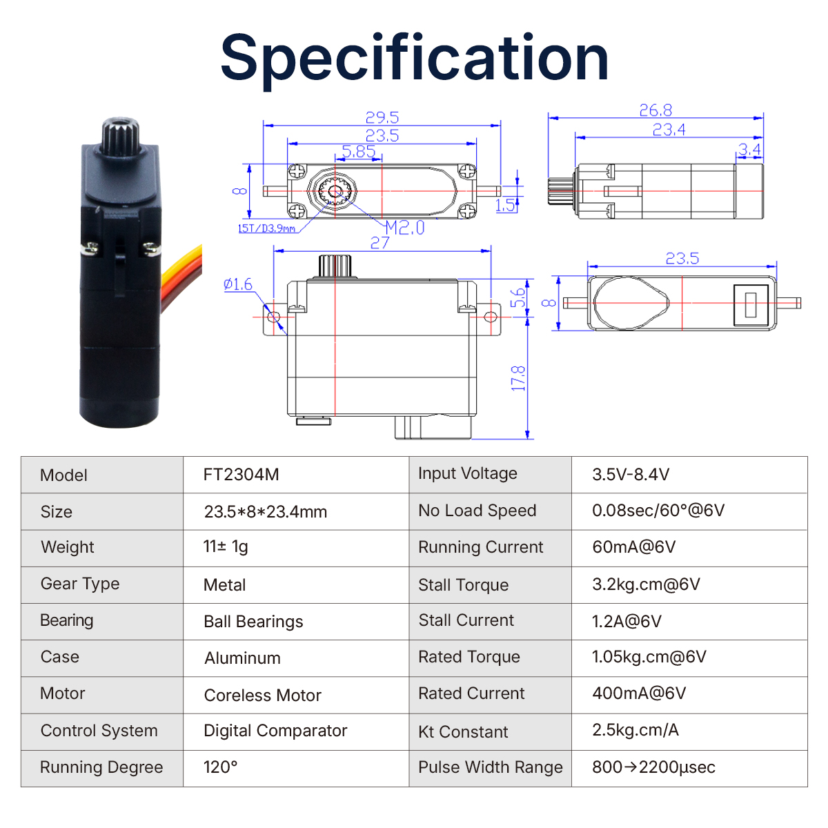 FEETECH FT2304M 6V 3.0kg.cm Digital 120 Degree Aluminum Shell Steel Tooth Hollow Cup Servo