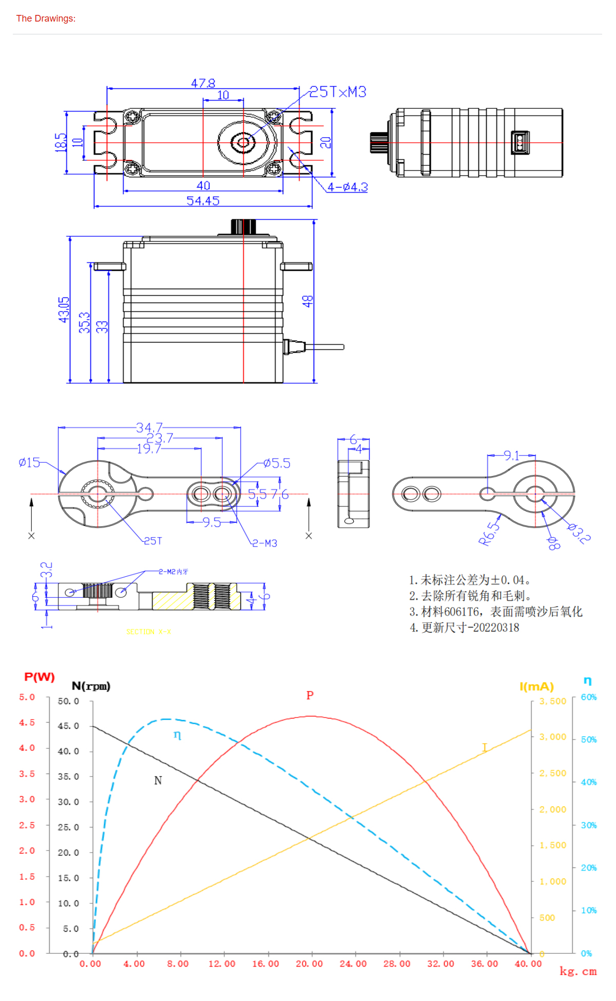 – Electronic protection: locked rotor for 3 seconds (after the steering gear is locked, the output torque will exceed the overload torque and continue to protect the torque after 3 seconds, the overload torque and protection time can be modified)