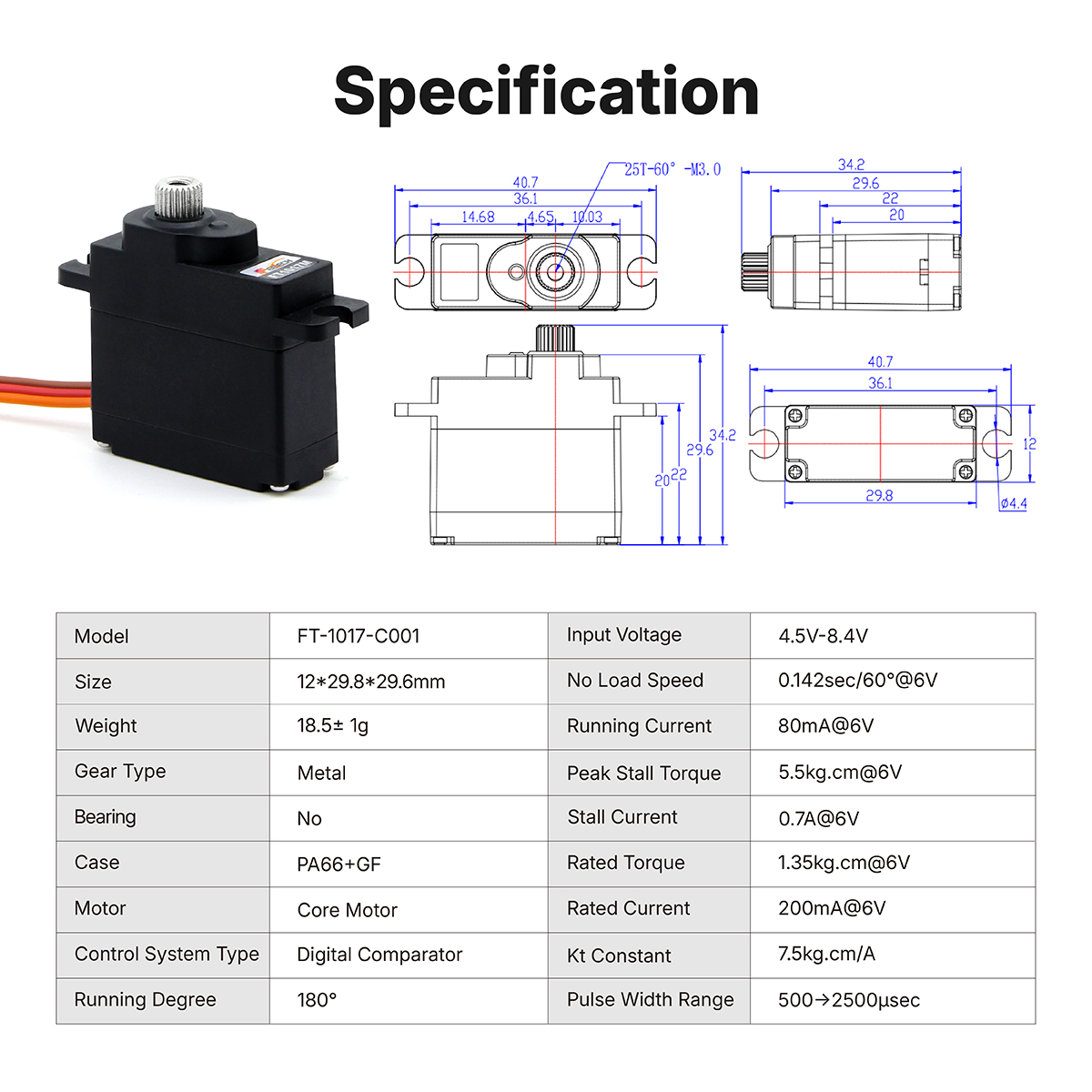Feetech FT1017M 6V 5.5kg Metal Gear Core Motor 180 Degree Micro Digital Servo for RC Car Model Robot