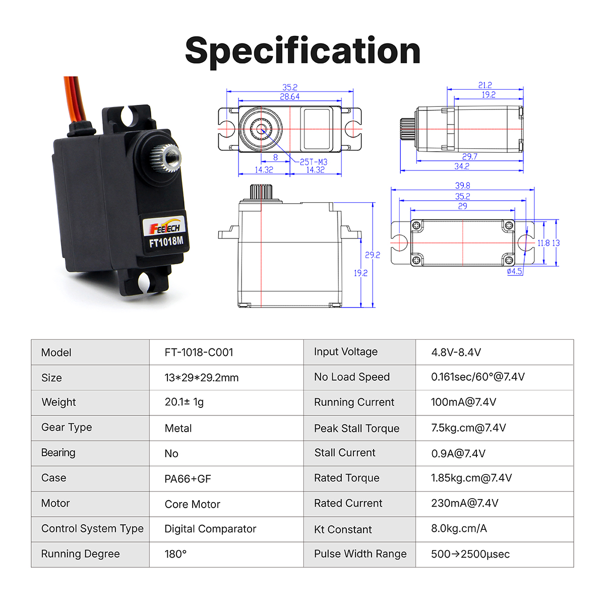Feetech FT1018M 7.4V 7.5kg Metal Gear Core Motor 180 Degree Digital Servo for RC Car Airplane