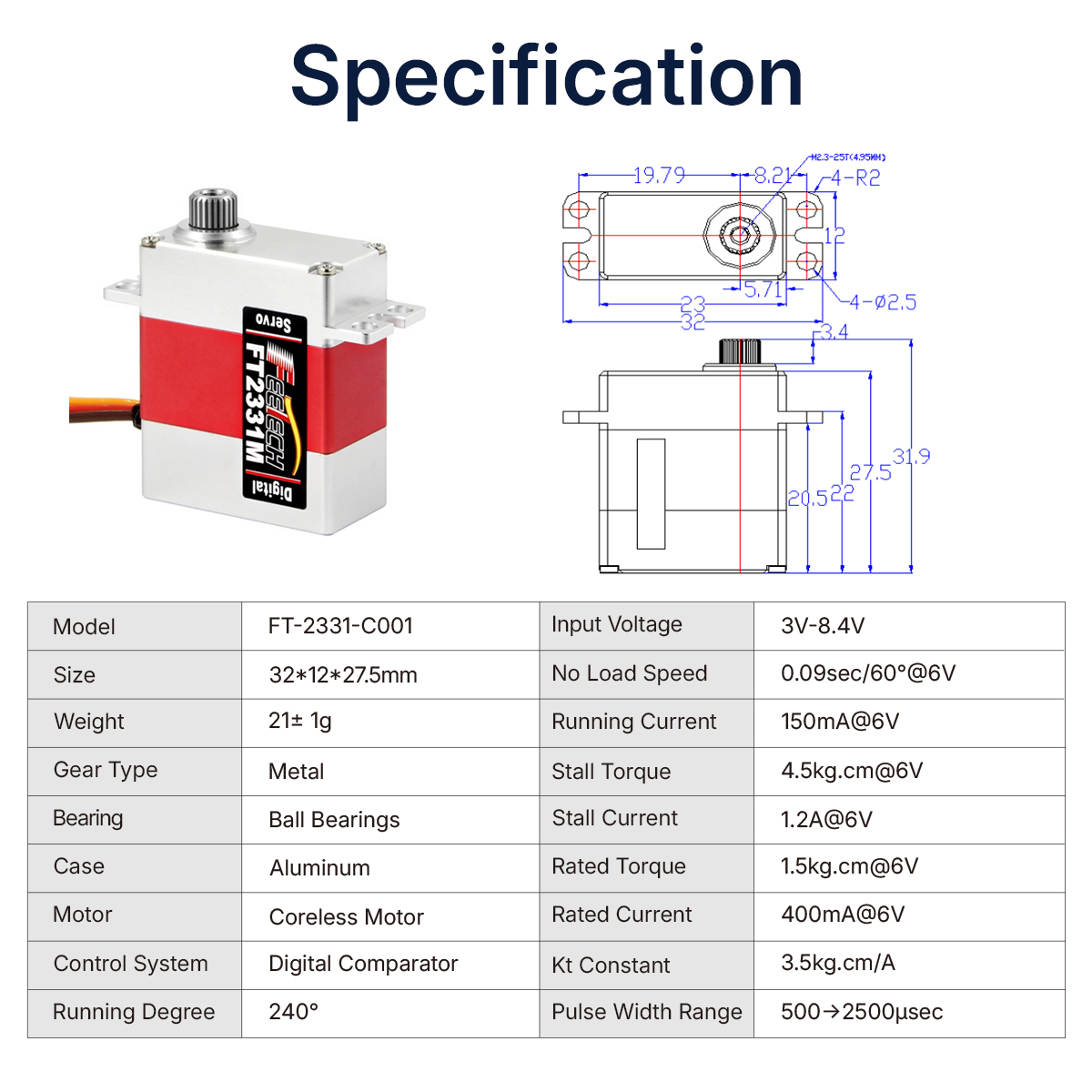 Feetech FT2331M 6V 4.5kg Metal Gear Coreless Motor Digital Servo for RC Car Glider Fixed Wings Drone
