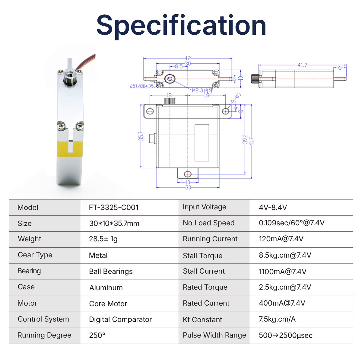 Feetech FT3325M 7.4V 8.5kg Metal Case 250 Degree Core Motor Mini Wing Digital Servo for Drift Rc Car Aircraft
