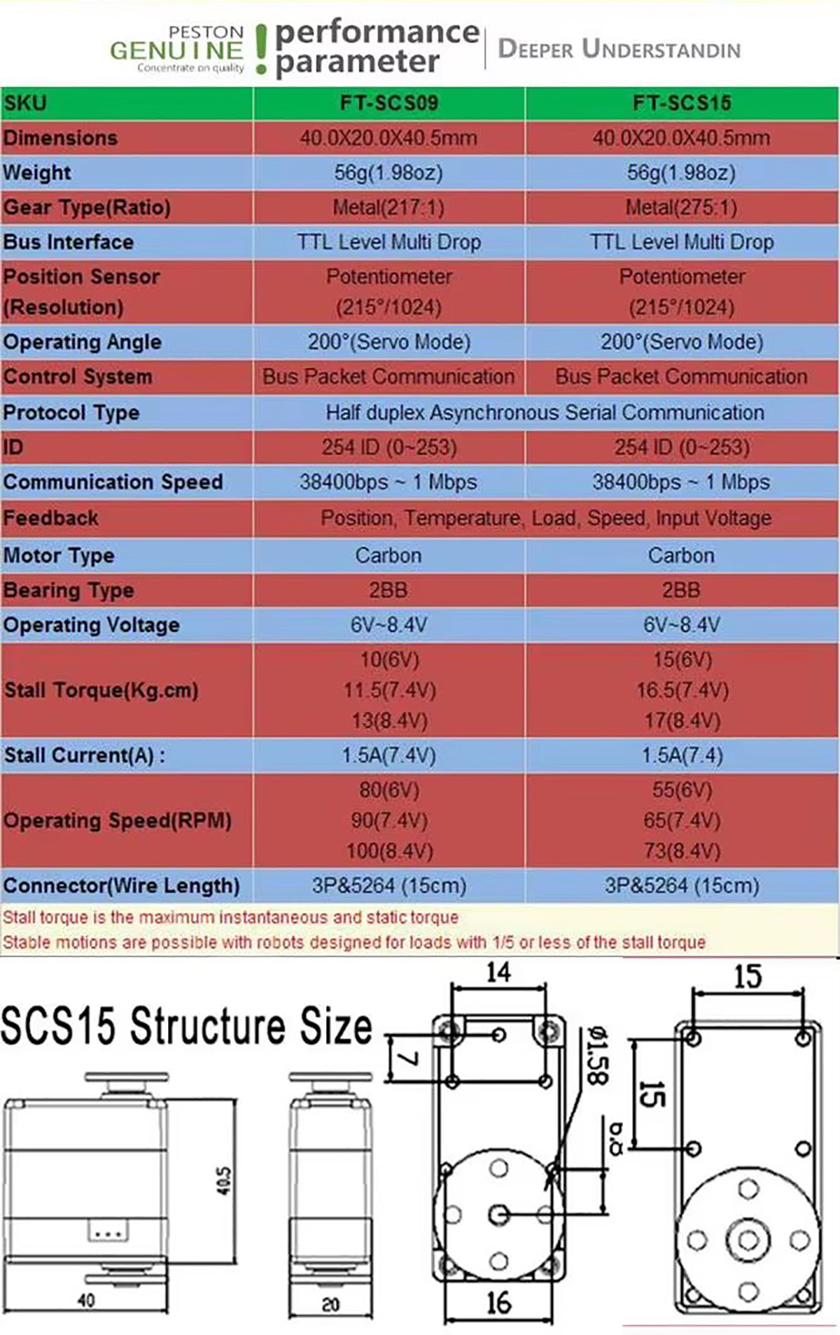 SCS15 is 7.4V15.6kg serial bus servo,adopt plastic case,metal gearbox、core motor, Feetech self researched and developed TTL control board,high quality potentiometer, 25T output shaft. The stall torque is 15.6kg.cm, effective control angle is 180 °, with servo mode and continuous motor working mode, feedback position, speed, voltage, temperature, load parameters, so as to achieve overload protection. It is suitable for teaching, maker, robot joints and other small torque transmission applications.