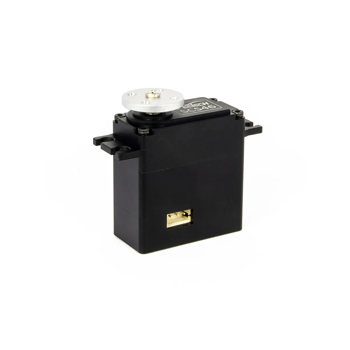 SCS46 7.4V 40kg single shaft serial bus smart servo,adopt full aluminum alloy case,to facilitate heat dissipation,metal gearbox、coreless motor, Feetech self researched and developed TTL control board,high quality potentiometer,25T output shaft. The stall torque is 40kg.cm,the effective control angle is 300°, it has servo mode and continuous rotation motor working mode,can feedback position、speed、voltage、current、temperature、load parameters,thus, overload protection can be realized. It is suitable for the application scenarios of teaching, maker, small torque and low frequency.