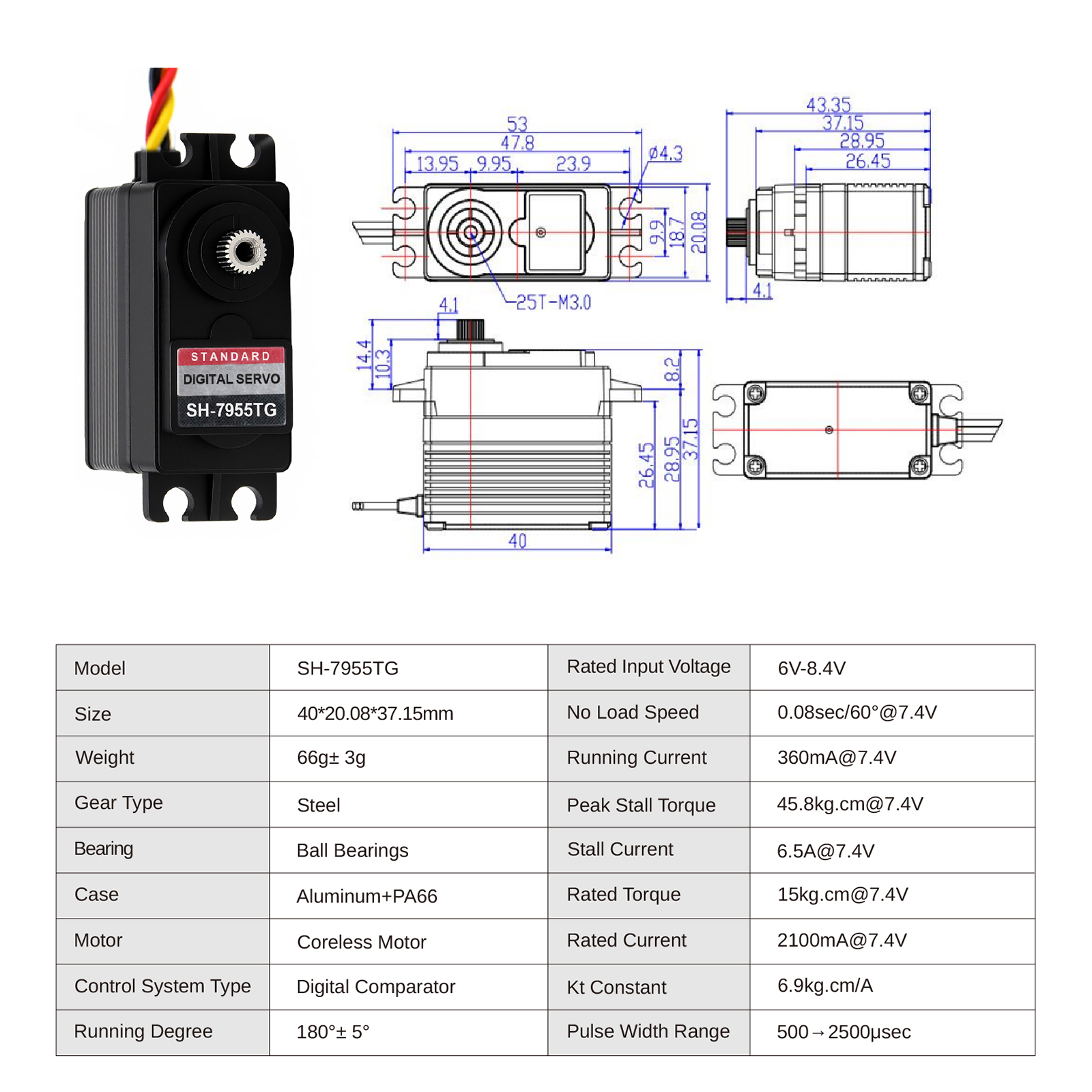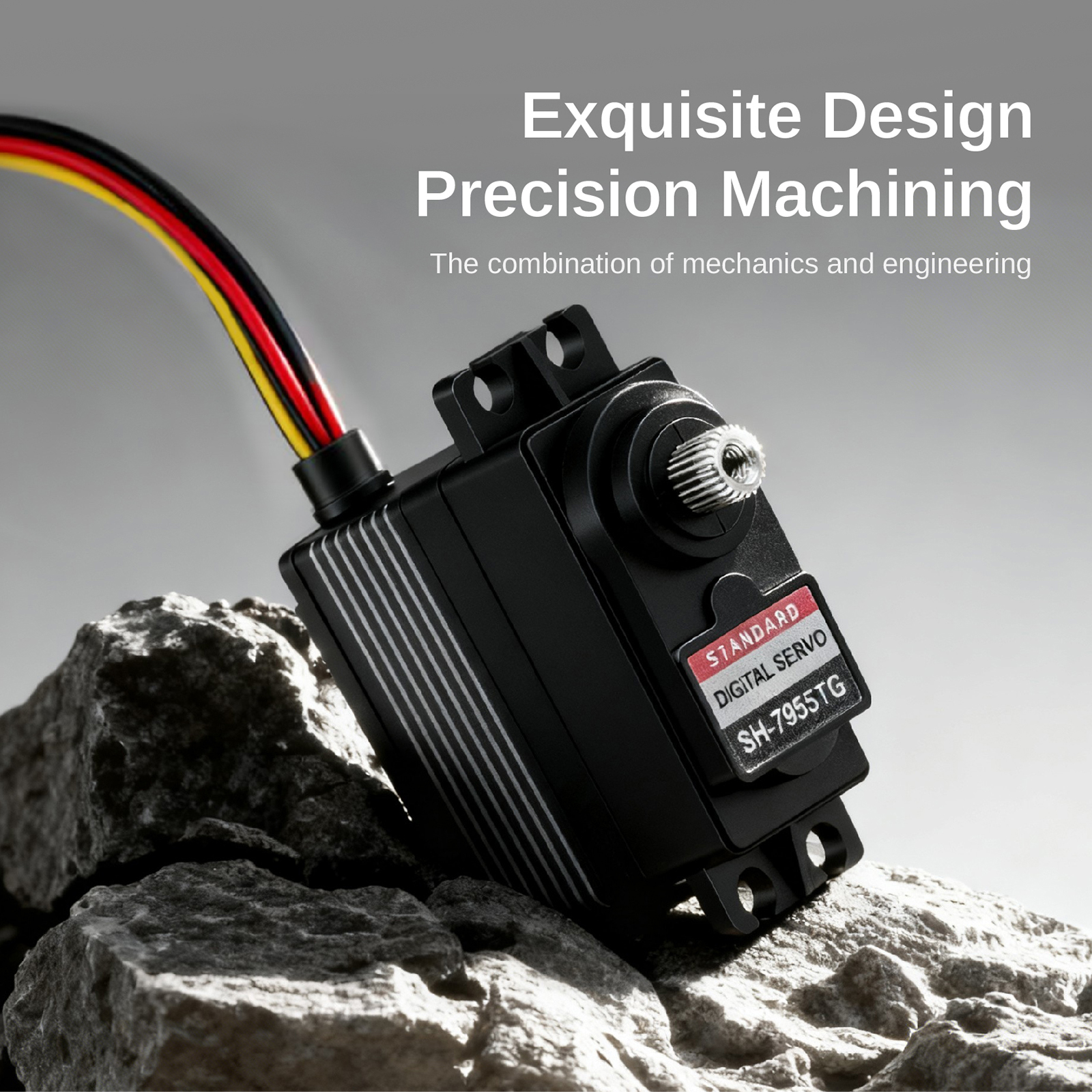 This servo is a high-performance factory alternative to the HS-7955TG model, designed for scenarios requiring strong torque, fast response, and water resistance. It adopts a coreless motor and 2BB bearings, ensuring stable operation and long service life. Suitable for industrial equipment, robotics, remote-controlled machinery, and other high-demand applications
