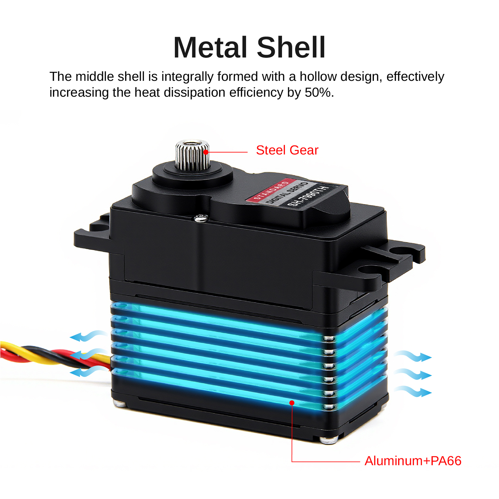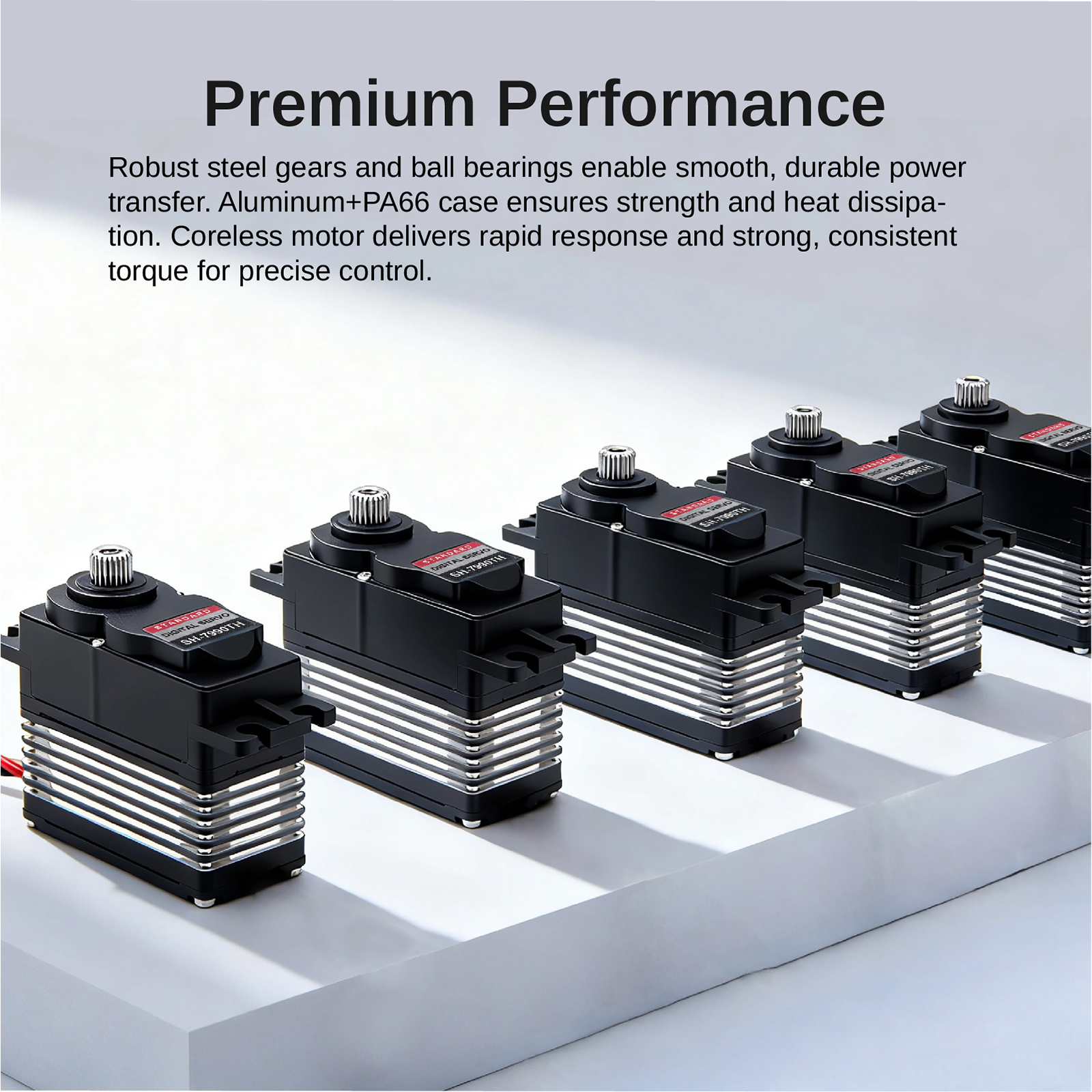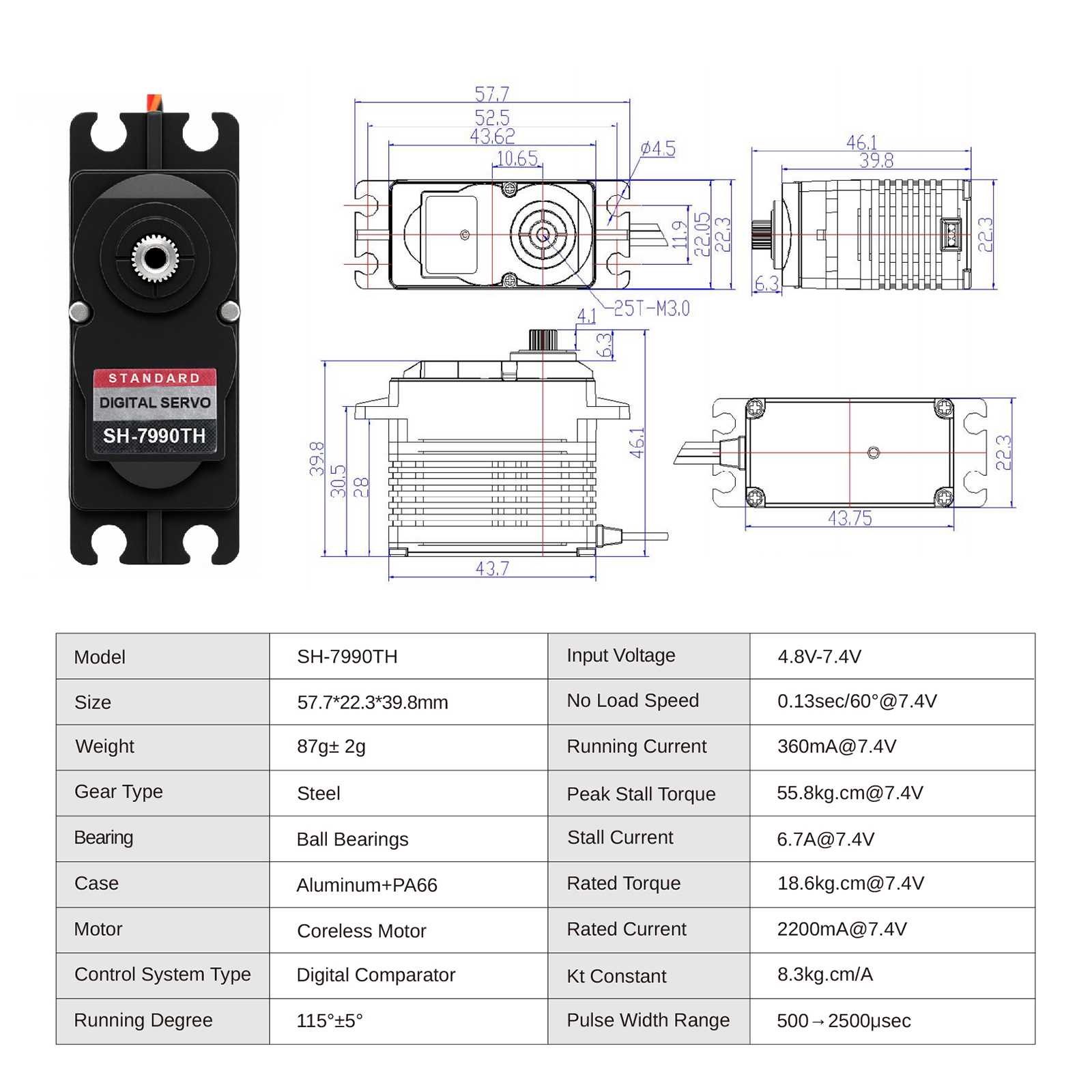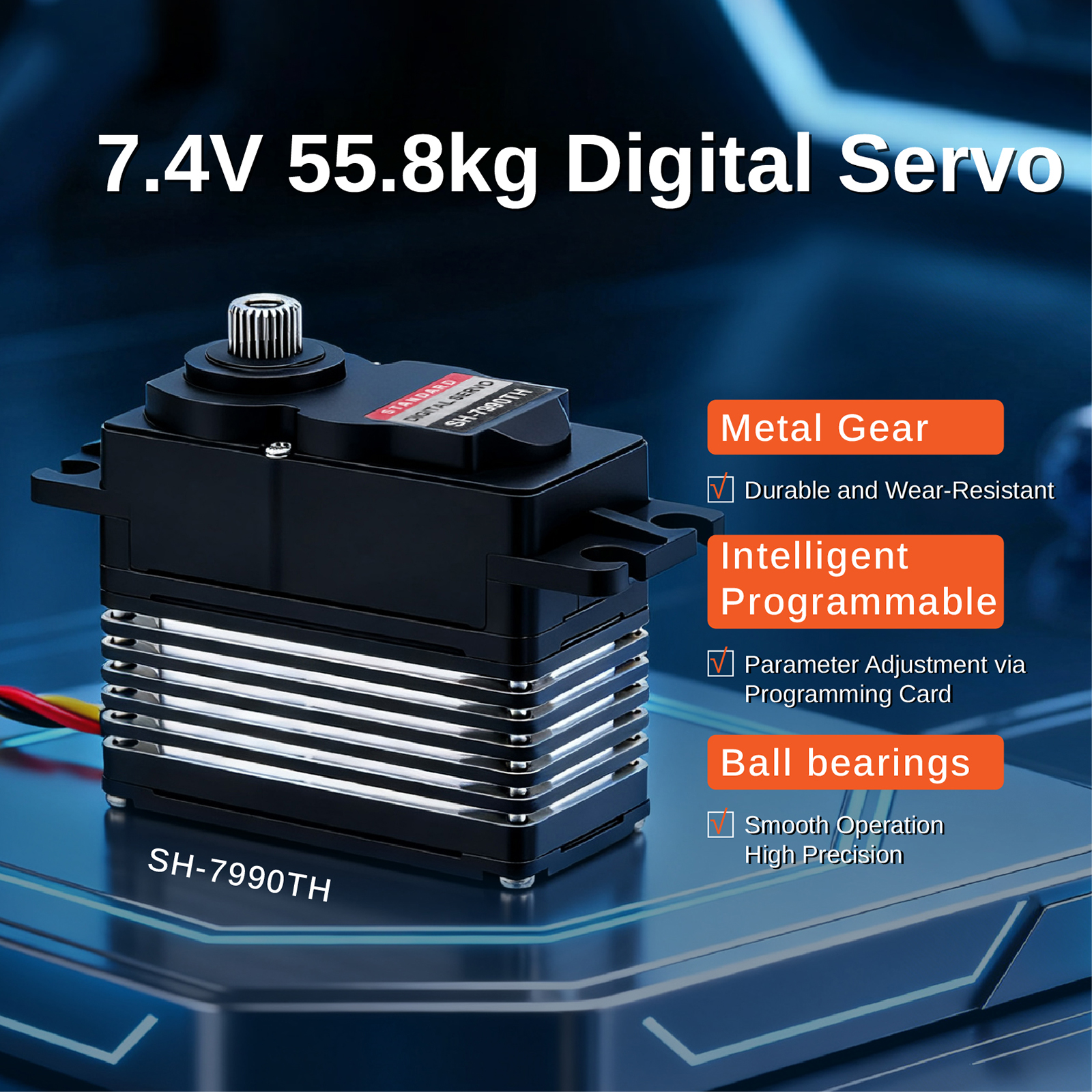 The SH-7990TH digital servo is a high-performance factory alternative to the HS-7980TH and HS-7990TH models, engineered for heavy-duty applications requiring high torque, stable voltage compatibility, and durable titanium gears. Equipped with a coreless motor and 2BB bearings, it delivers fast response speeds, reliable load-bearing capacity, and long operational life—ideal for industrial automation, robotics, large RC models, and agricultural machinery. Its compact design and JR connector compatibility ensure easy integration into existing systems.