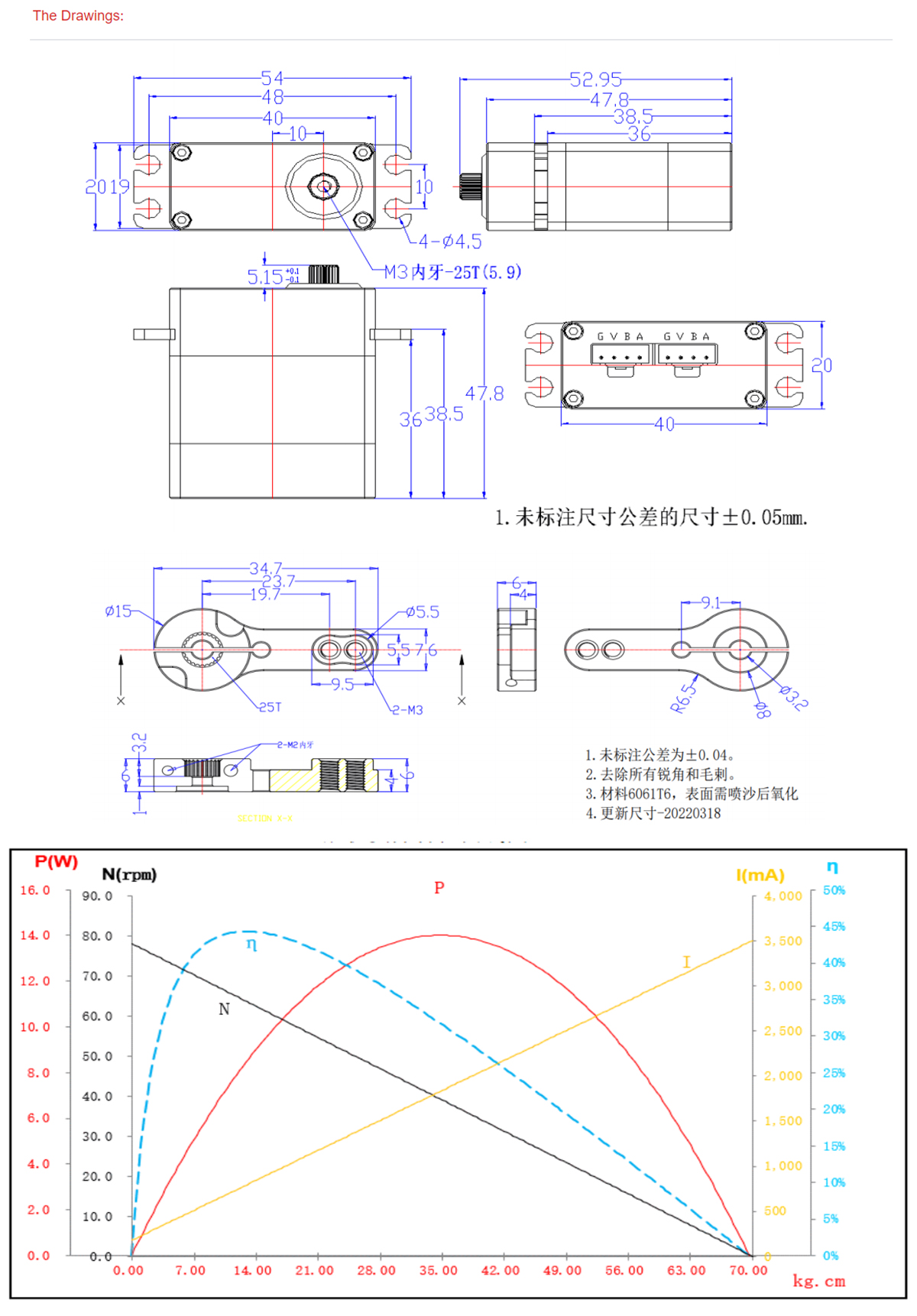 SM70BL is compatible 12V/24V serial port smart bus servo,all aluminum alloy shell、brushless motor、steel gearbox、Feetech self researched and developed RS485 control board,12 bit high precision magnetic coding sensor,25T output shaft. The stall torque is 70kg.cm can achieve 0-360 degrees any angle controllable,multi-turn continuous operation mode,it can realize the function of setting the middle point with one key,acceleration slow start and slow stop,can feedback position、speed、voltage、current、temperature、load parameters,thus, overload and over-current protection can be realized. It is suitable for application in industrial equipment, logistics, robot and other industries.