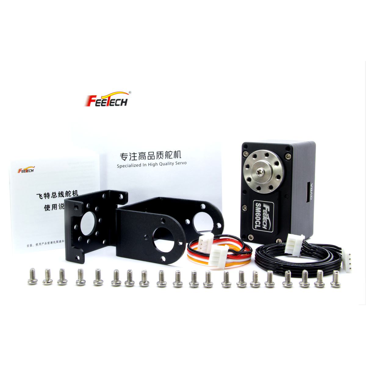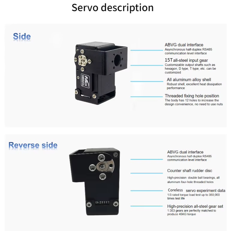 SM-60CL-C001 is 12V serial port smart bus servo,all aluminum alloy shell、coreless motor、steel gearbox、Feetech self researched and developed RS485 control board,12 bit high precision magnetic coding sensor,external connect stainless steel main servo horn. The stall torque is 60kg.cm,can achieve 0-360 degrees any angle controllable,multi-turn continuous operation mode,it can realize the function of setting the middle point with one key,acceleration slow start and slow stop,can feedback position、speed、voltage、current、temperature、load parameters,thus, overload and over-current protection can be realized. It is suitable for application in industrial equipment, robot and other industries.
