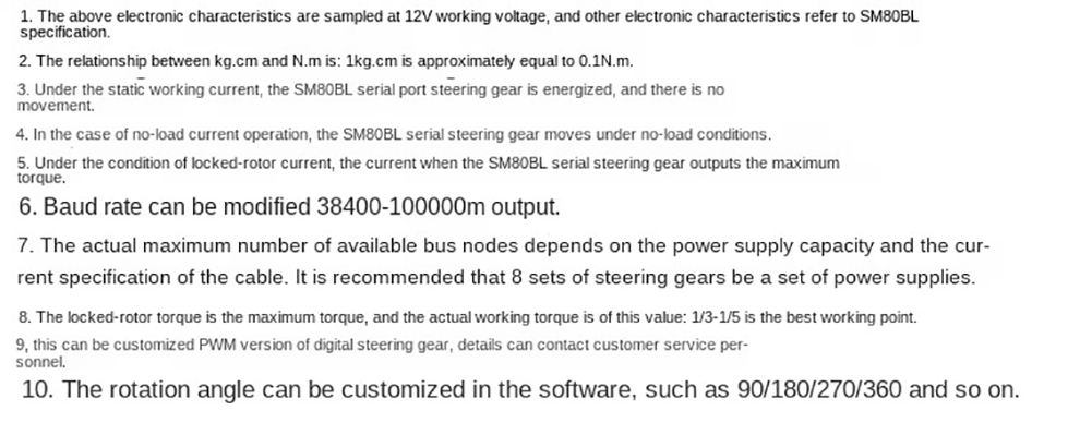 SM80BL is 12V serial port smart bus servo,all aluminum alloy shell、brushless motor、steel gearbox、Feetech self researched and developed RS485 control board,12 bit high precision magnetic coding sensor,external connect stainless steel main servo horn. The stall torque is 80kg.cm,can achieve 0-360 degrees any angle controllable,multi-turn continuous operation mode,it can realize the function of setting the middle point with one key,acceleration slow start and slow stop,can feedback position、speed、voltage、current、temperature、load parameters,thus, overload and over-current protection can be realized. It is suitable for application in industrial equipment, robot and other industries.