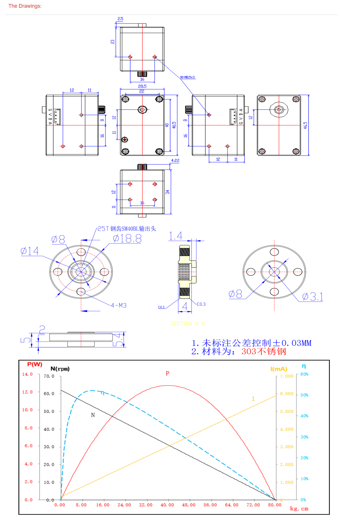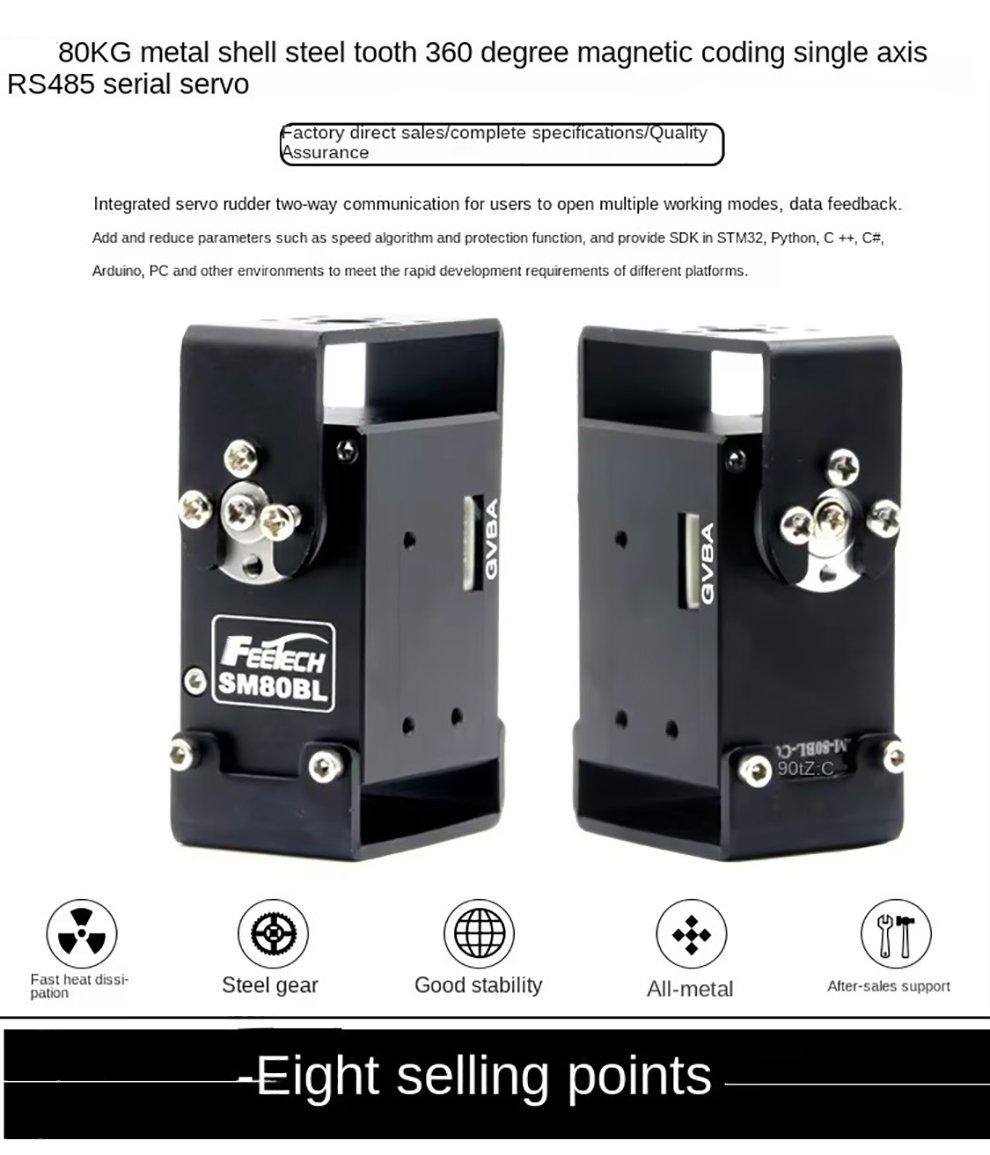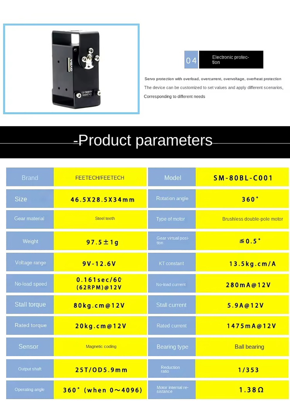 SM80BL is 12V serial port smart bus servo,all aluminum alloy shell、brushless motor、steel gearbox、Feetech self researched and developed RS485 control board,12 bit high precision magnetic coding sensor,external connect stainless steel main servo horn. The stall torque is 80kg.cm,can achieve 0-360 degrees any angle controllable,multi-turn continuous operation mode,it can realize the function of setting the middle point with one key,acceleration slow start and slow stop,can feedback position、speed、voltage、current、temperature、load parameters,thus, overload and over-current protection can be realized. It is suitable for application in industrial equipment, robot and other industries.