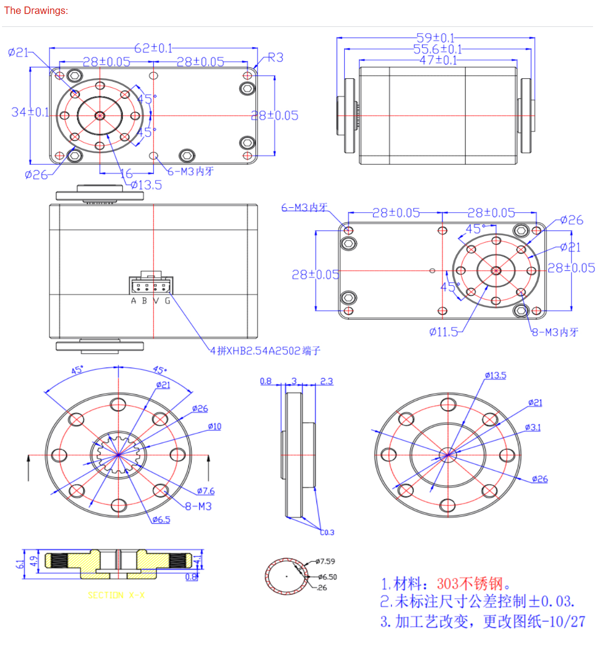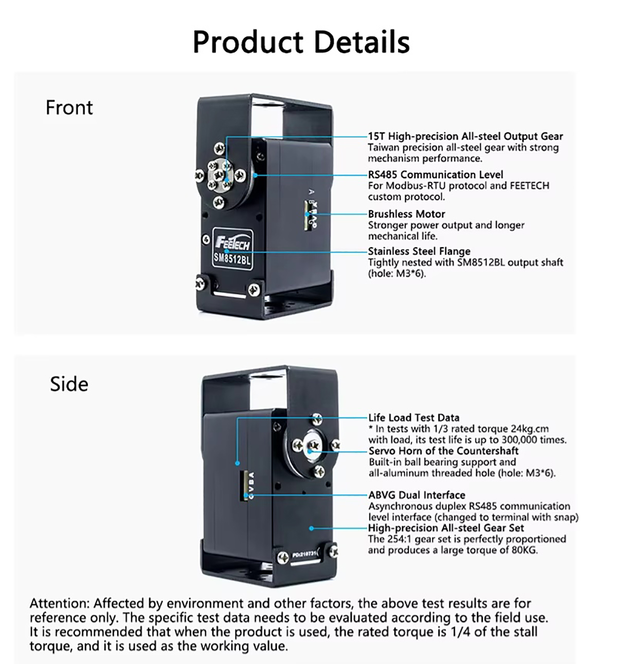 SM8512BL is 12V serial port smart bus servo,all aluminum alloy shell is adopted、brushless motor、steel gearbox、Feetech self researched and developed RS485 control board,12 bit high precision magnetic coding sensor,external connect stainless steel main servo horn. The stall torque is 85kg.cm,can achieve 0-360 degrees any angle controllable,multi-turn continuous operation mode,it can realize the function of setting the middle point with one key,acceleration slow start and slow stop,can feedback position、speed、voltage、current、temperature、load parameters,thus, overload and over-current protection can be realized. It is suitable for application in industrial equipment, robot and other industries.