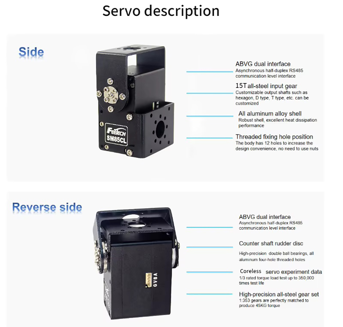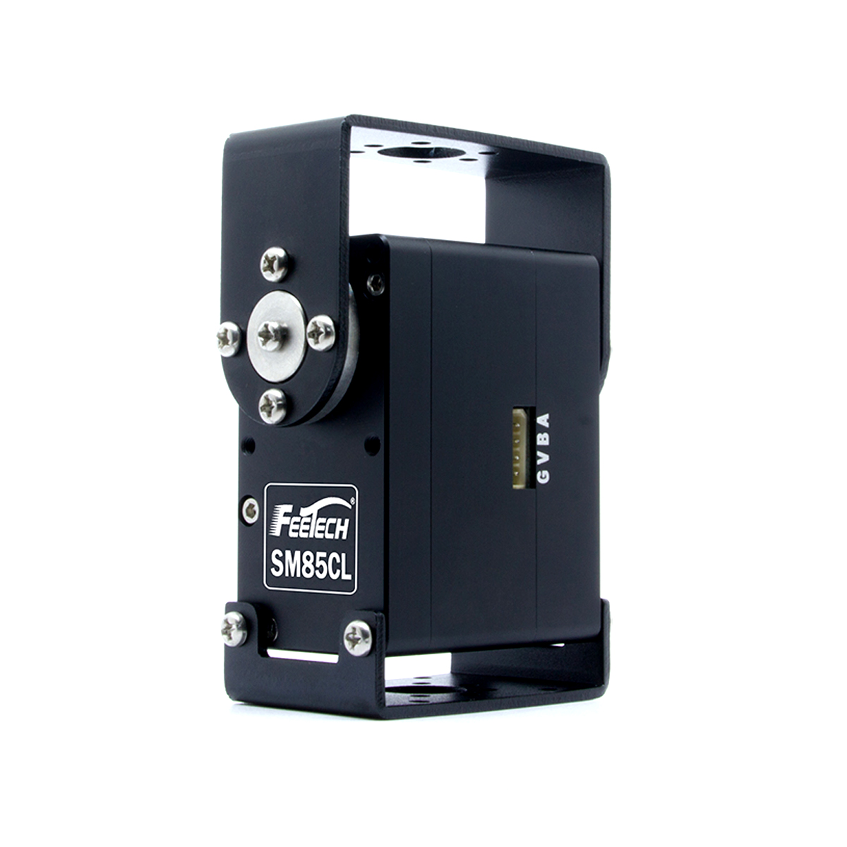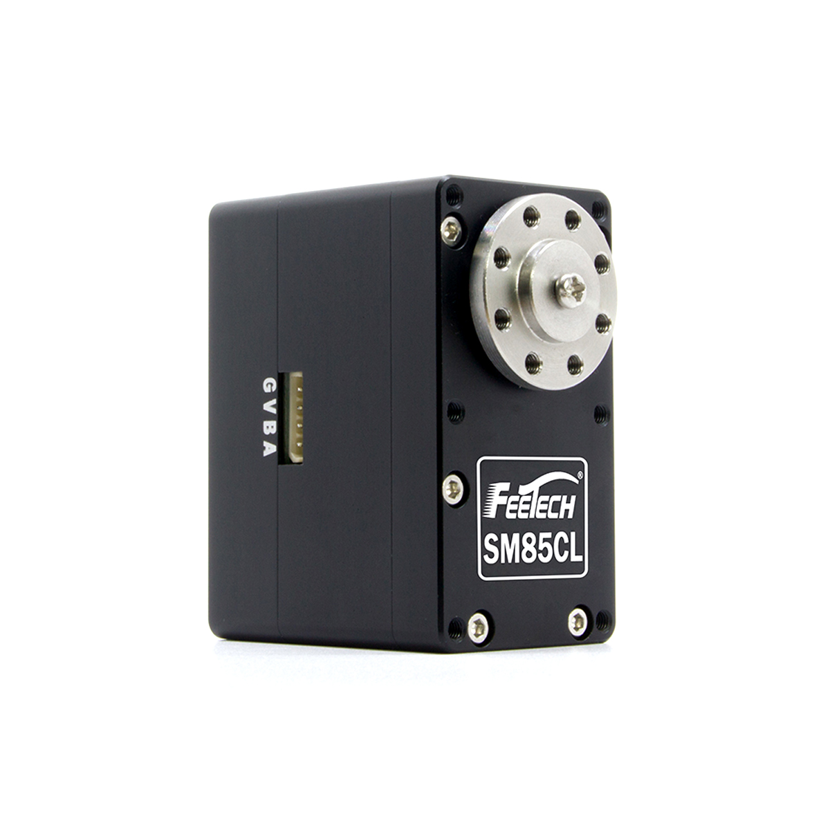 SM-85CL-C001 is 12V serial port smart bus servo,all aluminum alloy shell 、coreless motor、steel gearbox、Feetech self researched and developed RS485 control board,12 bit high precision magnetic coding sensor,external connect stainless steel main servo horn. The stall torque is 85kg.cm,can achieve 0-360 degrees any angle controllable,multi-turn continuous operation mode, it can realize the function of setting the middle point with one key,acceleration slow start and slow stop,can feedback position、speed、voltage、current、temperature、load parameters,thus, overload and over-current protection can be realized. It is suitable for application in industrial equipment, robot and other industries.