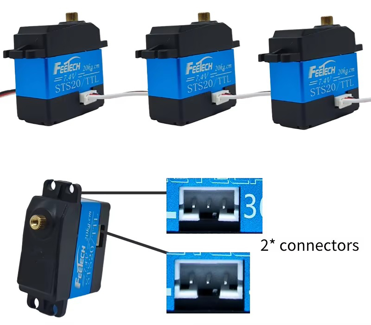 STS20 is 8.4V 24.3kg serial bus smart servo,adopt middle aluminum alloy case、core motor、metal gearbox, Feetech self researched and developed TTL control board, 12 bit high precision magnetic coding sensor. The stall torque is 8kg.cm, can feedback position、speed、voltage、current、temperature、load parameters,thus, overload and over-current protection can be realized. It is suitable for application in industrial equipment, robot and transmission application scenarios.