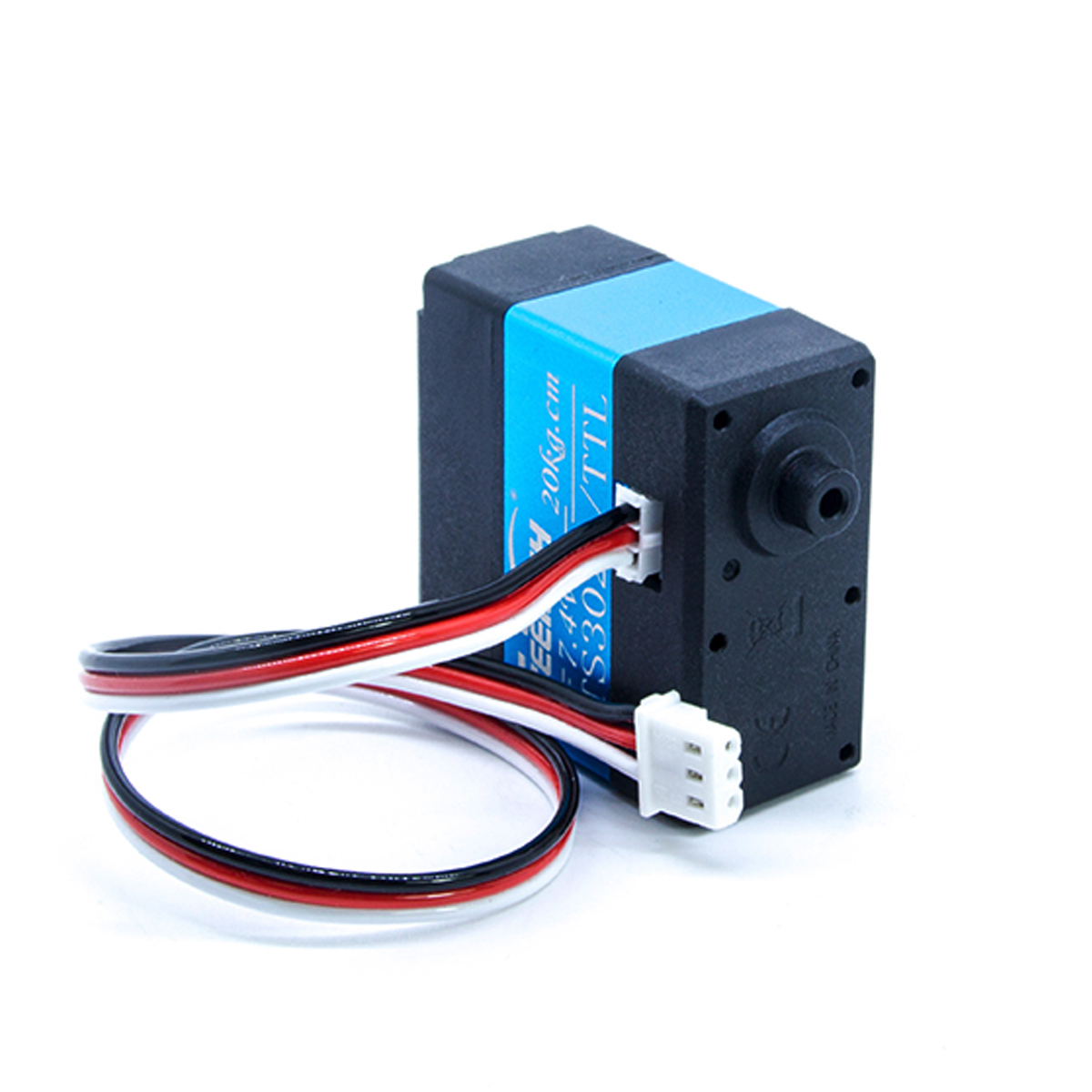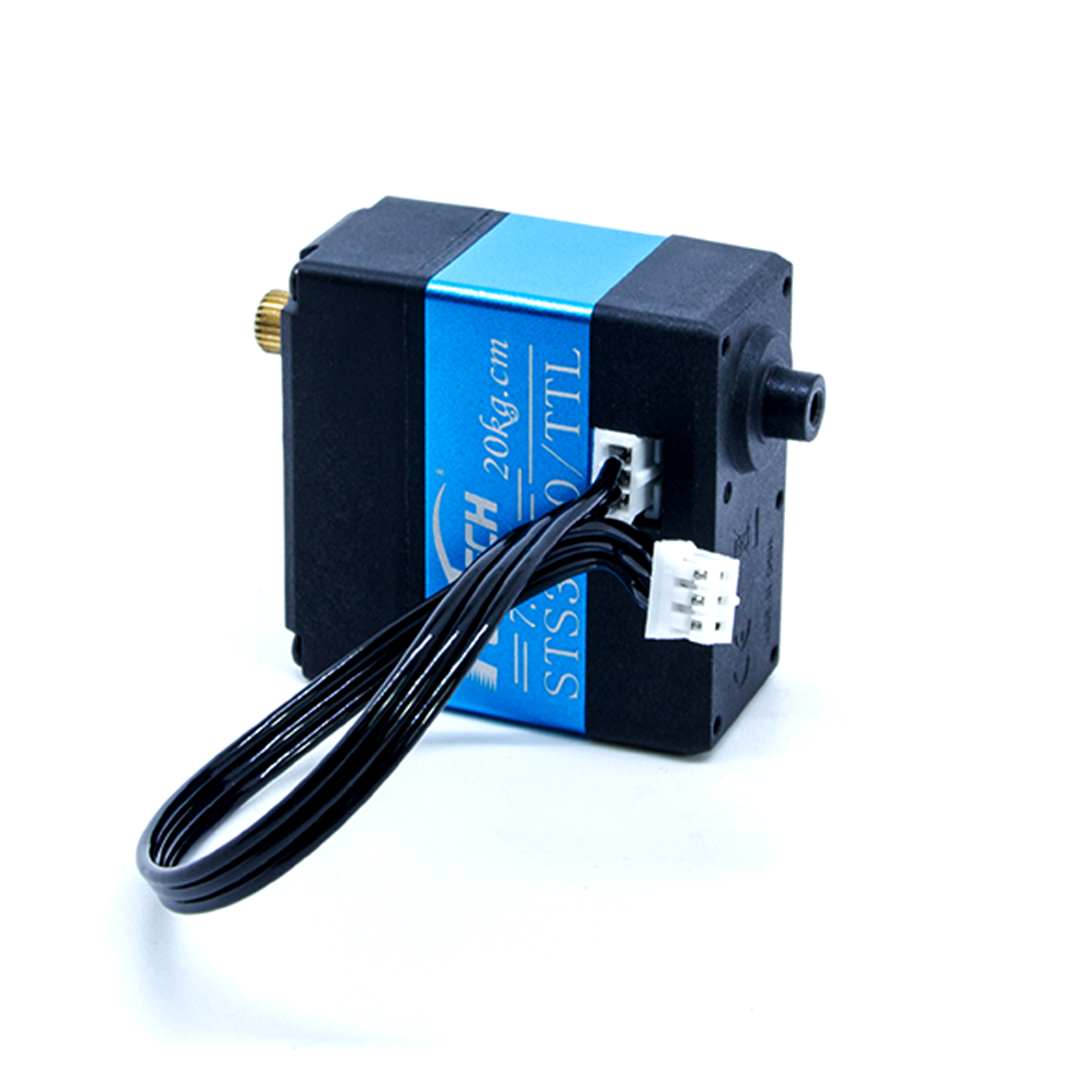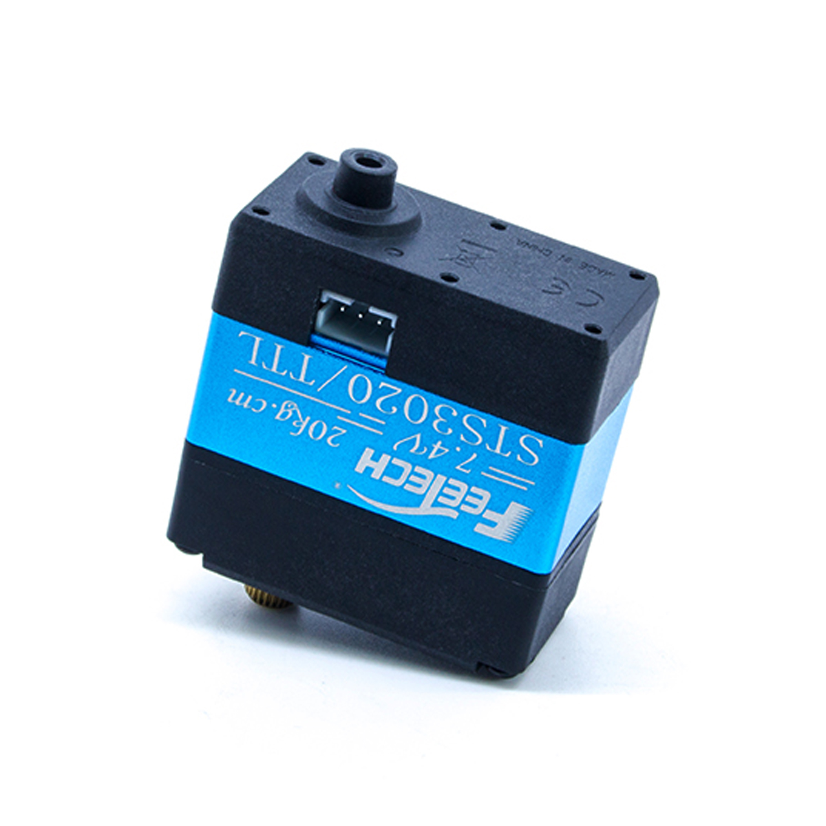 STS3020 is 8.4V 24.3kg serial bus smart servo,adopt middle aluminum alloy case、core motor、metal gearbox, Feetech self researched and developed TTL control board, 12 bit high precision magnetic coding sensor. The stall torque is 8kg.cm, can feedback position、speed、voltage、current、temperature、load parameters,thus, overload and over-current protection can be realized. It is suitable for application in industrial equipment, robot and transmission application scenarios.