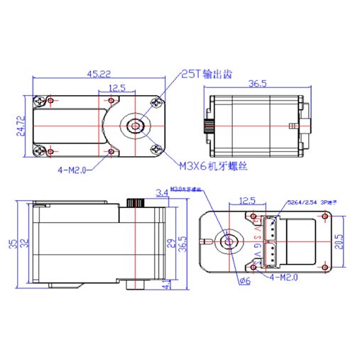 STS3250 is 12V 50kg serial bus smart servo,aluminum alloy case is used、corless motor、metal gearbox 、Feetech self researched and developed TTL control board,12 bit high precision magnetic coding sensor. The stall torque is 50kg.cm,can achieve 0-360 degrees any angle controllable,multi-turn continuous operation mode,it can realize the function of setting the middle point with one key,acceleration slow start and slow stop,can feedback position、speed、voltage、current、temperature、load parameters,thus, overload and over-current protection can be realized. It is suitable for application in industrial equipment, robot and Small torque drive application scenarios