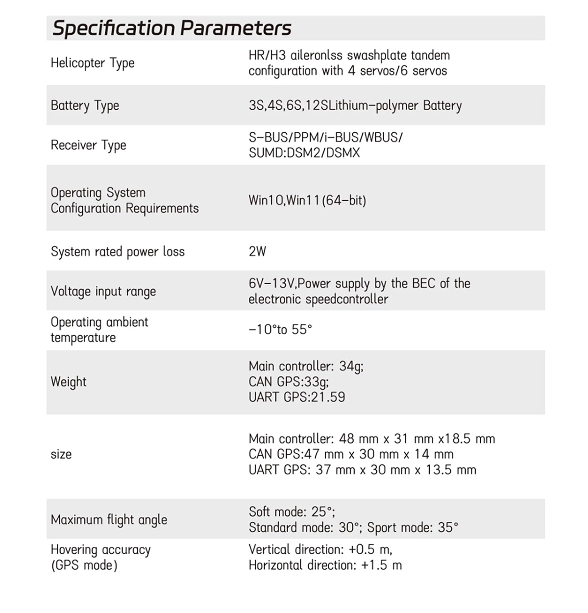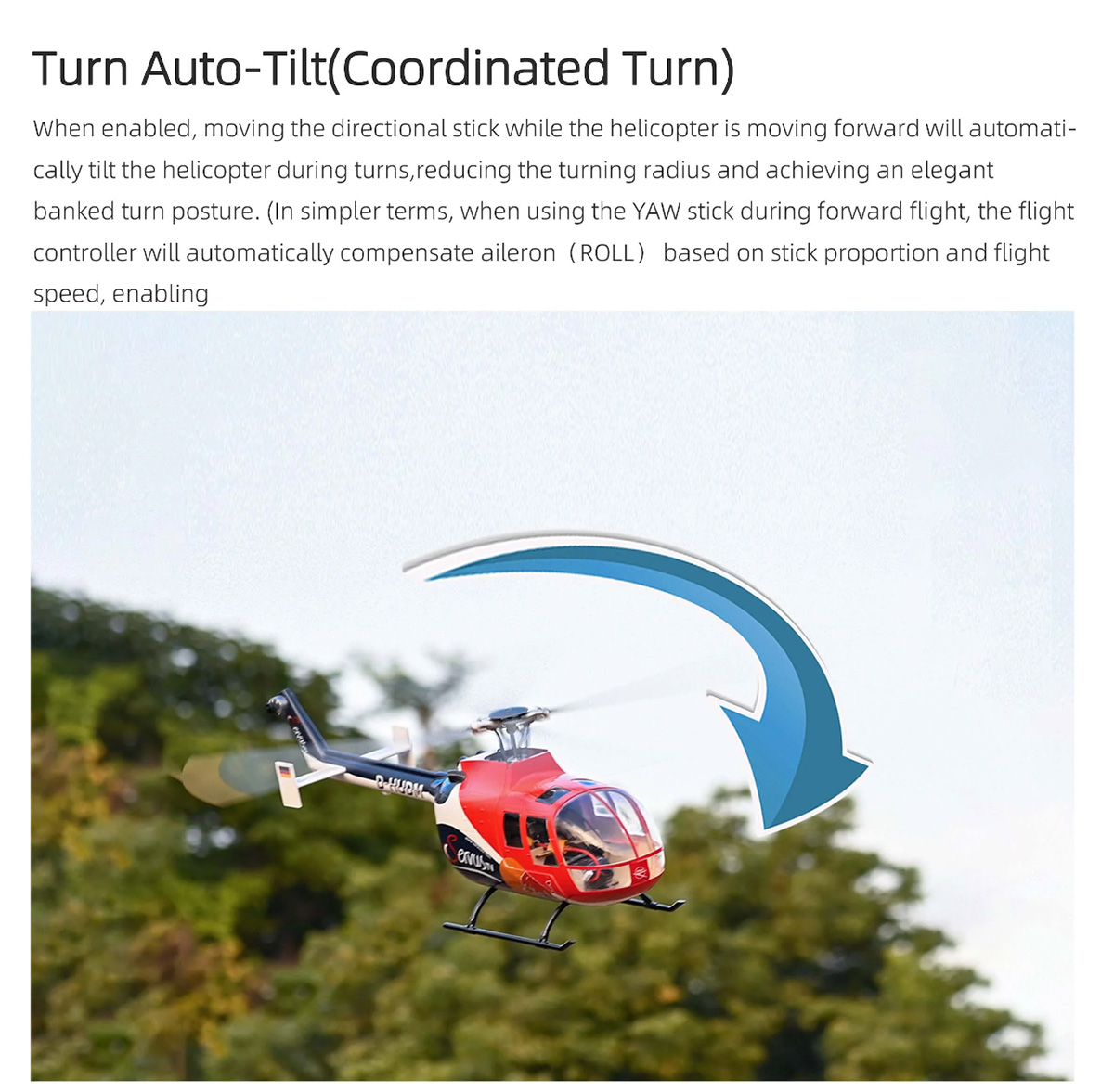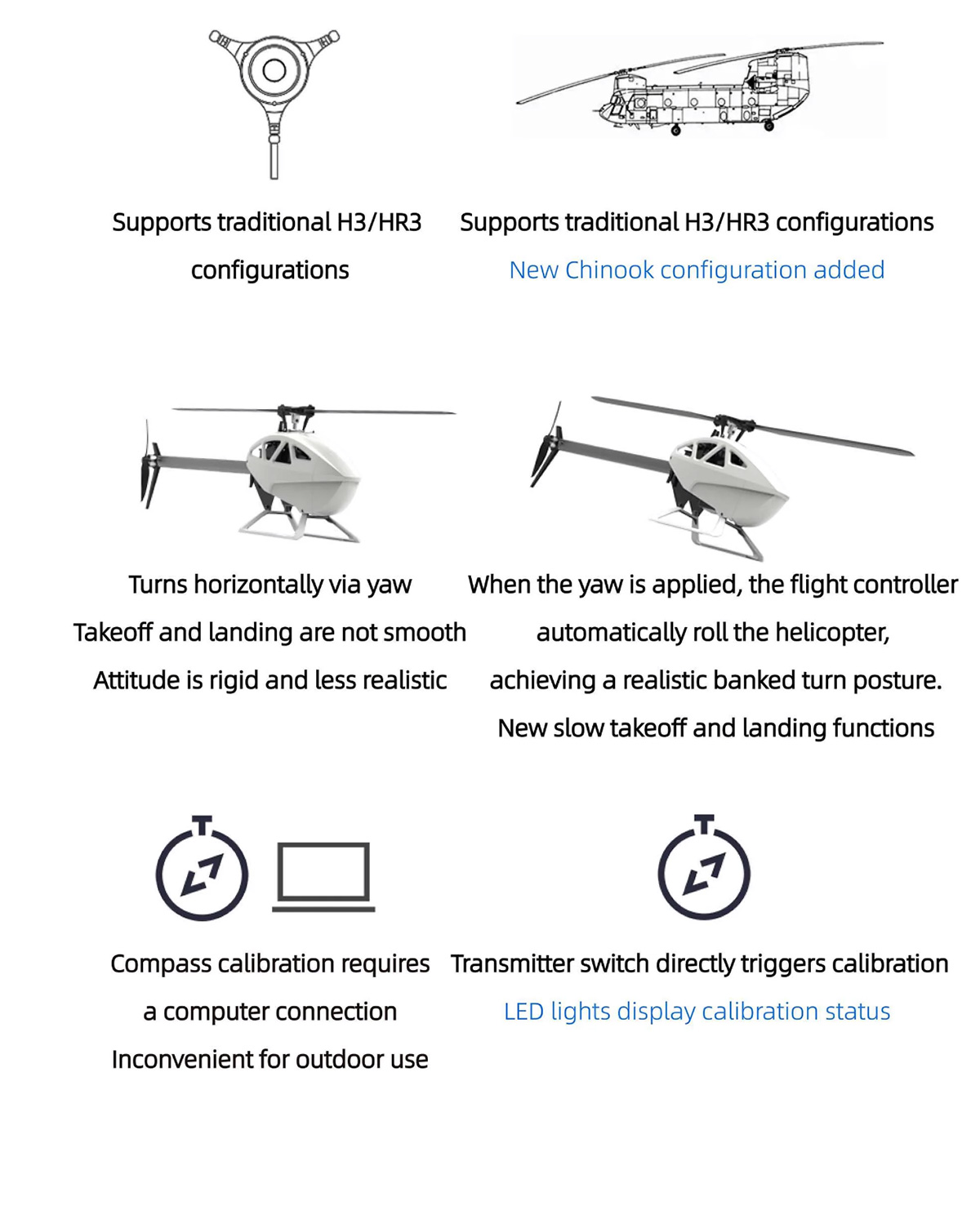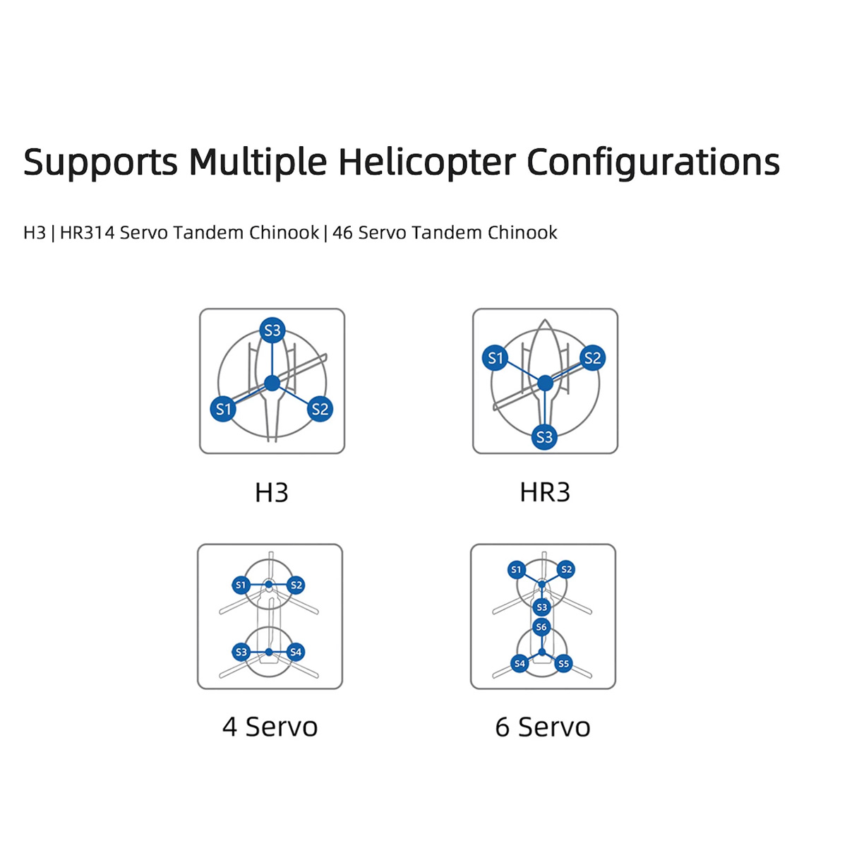 Helicopter Type: HR/H3 aileronless swashplate tandem configuration with 4 servos/6 servos