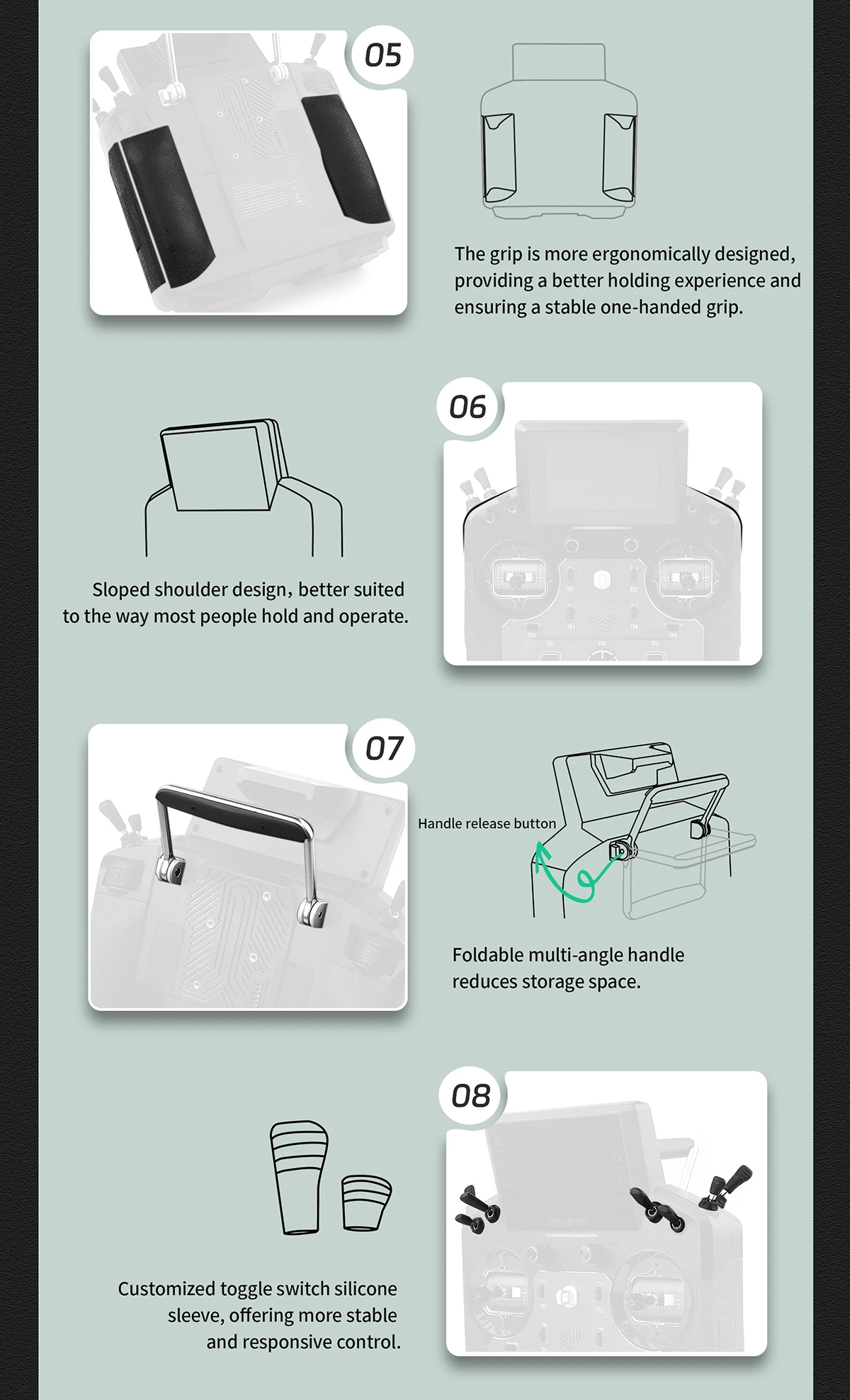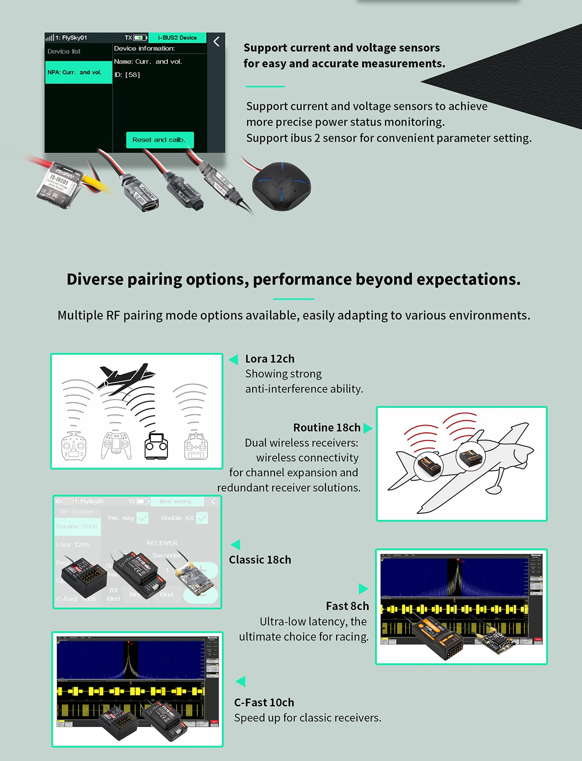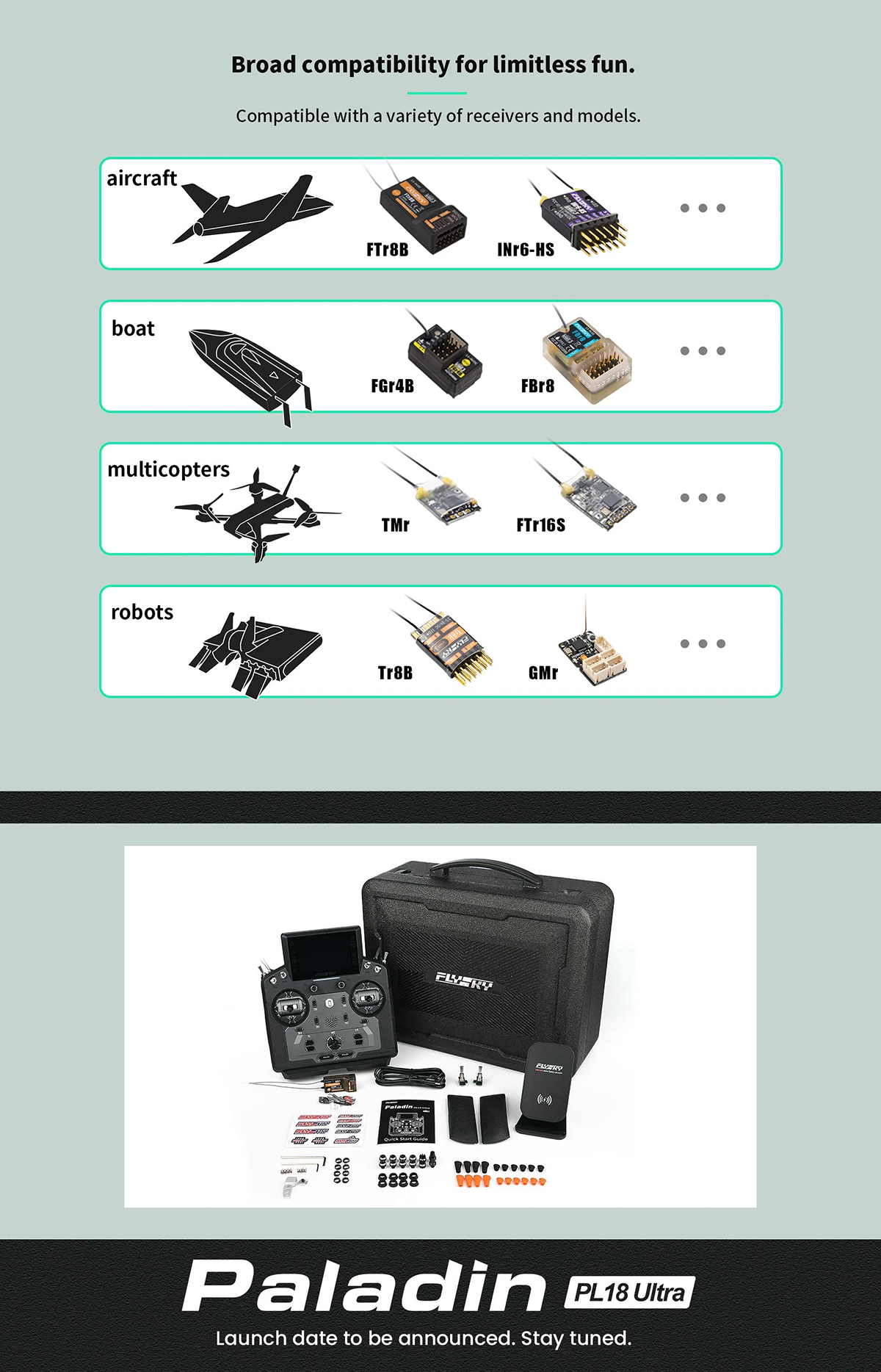 Compatible Receivers: Receiver with AFHDS 3 protocol, such as FTr12B, FTr8B, Tr8B, FTr10, FTr16S, FTr4, INr6-HS and TMr for RC air models, FGr8B, FGr4B, FGr12B, FGr4P, FGr4S, FGr4 and GMr for RC cars, FBr12 for RC boats, etc.