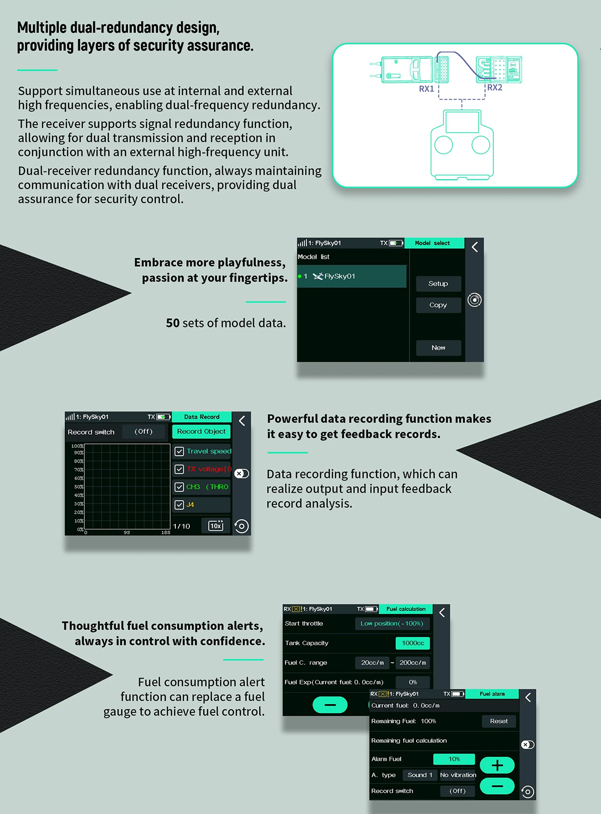 Dual redundancy signal protection, 50 model storage slots, supports data recording, fuel alert, and sensor monitoring