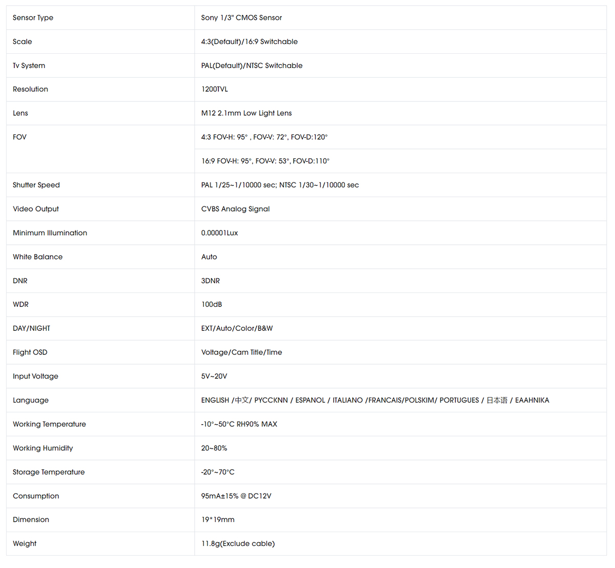 FOV: 4:3 FOV-H: 95°,FOV-V: 72°,FOV-D:120°;16:9 FOV-H: 95°,FOV-V: 53°,FOV-D:110°