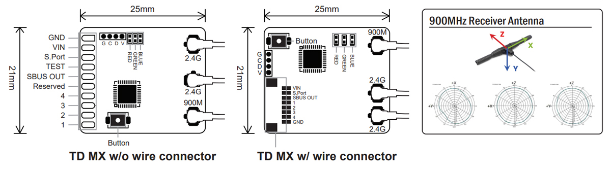 TD MX offers 4 PWM channels on a small and lightweight board, and it also has multiple ports onboard like SBUS Out, S.Port and FBUS. With the FBUS protocol, the Tandem series receivers can open up the possibility of seamlessly pairing with multiple telemetry devices (Neuron ESC, Advance Sensors, etc.) as well as simplifying the builds setup. In addition, the data (Power & Signal related) under unusual status during the flight can be recorded by Tandem receivers through the built-in black-box function.