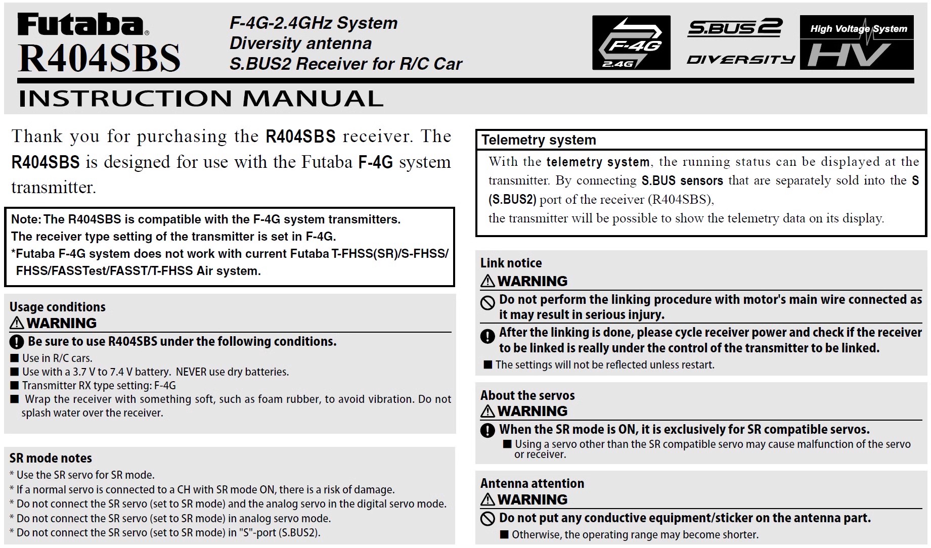 Futaba R404SBS R404SBS-E F-4G Telemetry 2.4GHz S.BUS2 Receiver for Model RC Car Boat Toy