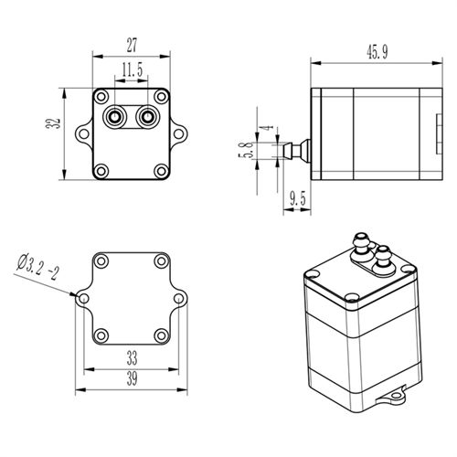 It weighs only 87 grams. The applicable voltage is 6V-8.4V. It is recommended to connect to the distribution board and apply 7.4V power supply. When 7.4V , Working current 1.2A, flow 1.1 liters per minute. On the plane, it can be installed horizontally and fixed with double-sided tape and cable ties, or it can be installed upside down vertically and fixed with screws, which saves more space. The flow can be controlled and adjusted through the remote control knob channel or switch channel.