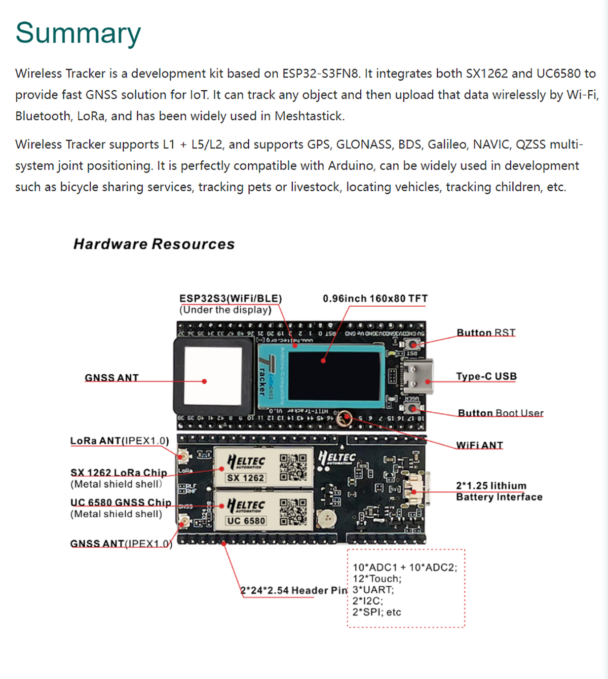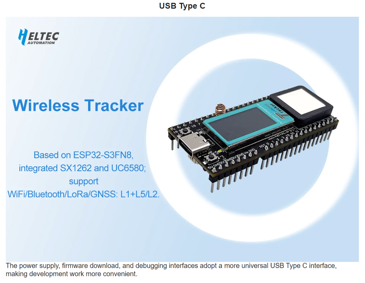 Wireless Tracker is a development kit based on ESP32-S3FN8. It integrates both SX1262 and UC6580 to provide fast GNSS solution for IoT. It can track any object and then upload that data wirelessly by Wi-Fi, LoRa, and has been widely used in Meshtastick.
