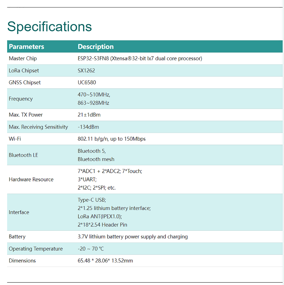 Interface: Type-C USB;2*1.25 lithium battery interface;LoRa ANT(IPEX1.0);2*18*2.54 Header Pin