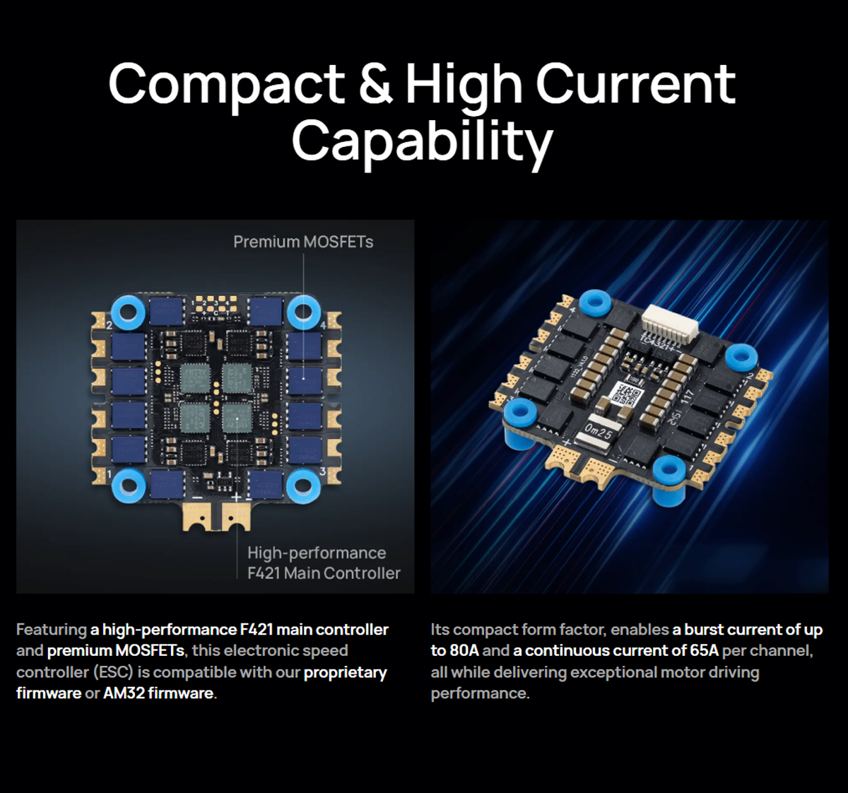 Its compact form factor, enables a burst current of up to 80A and a continuous current of 65A per channel, all while delivering exceptional motor driving performance.