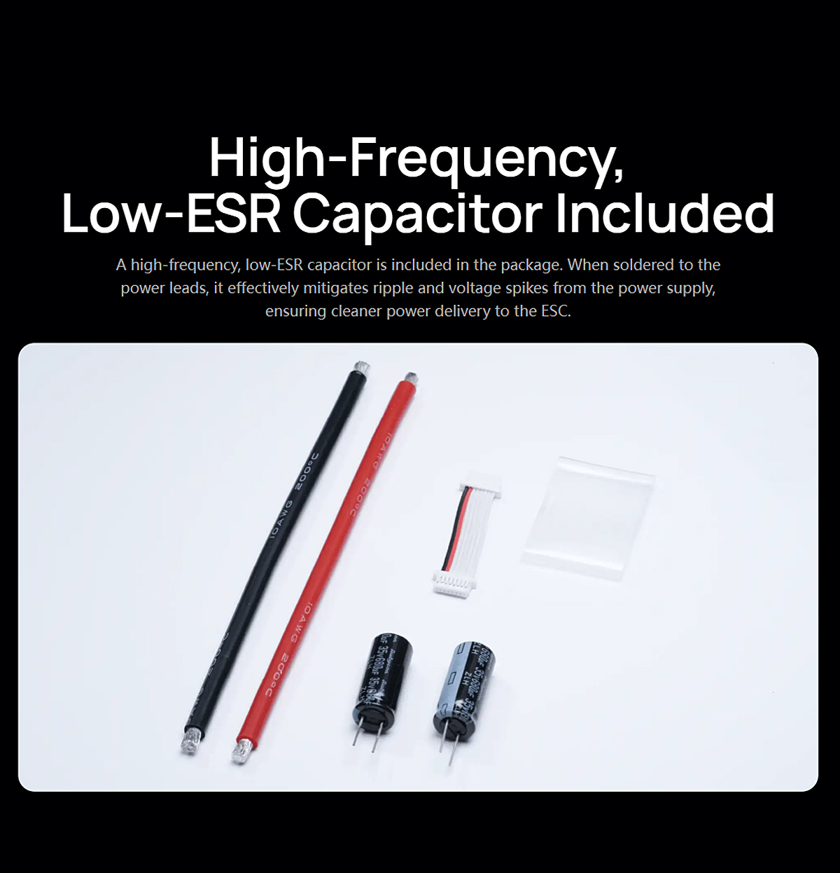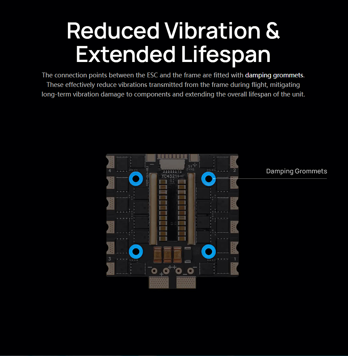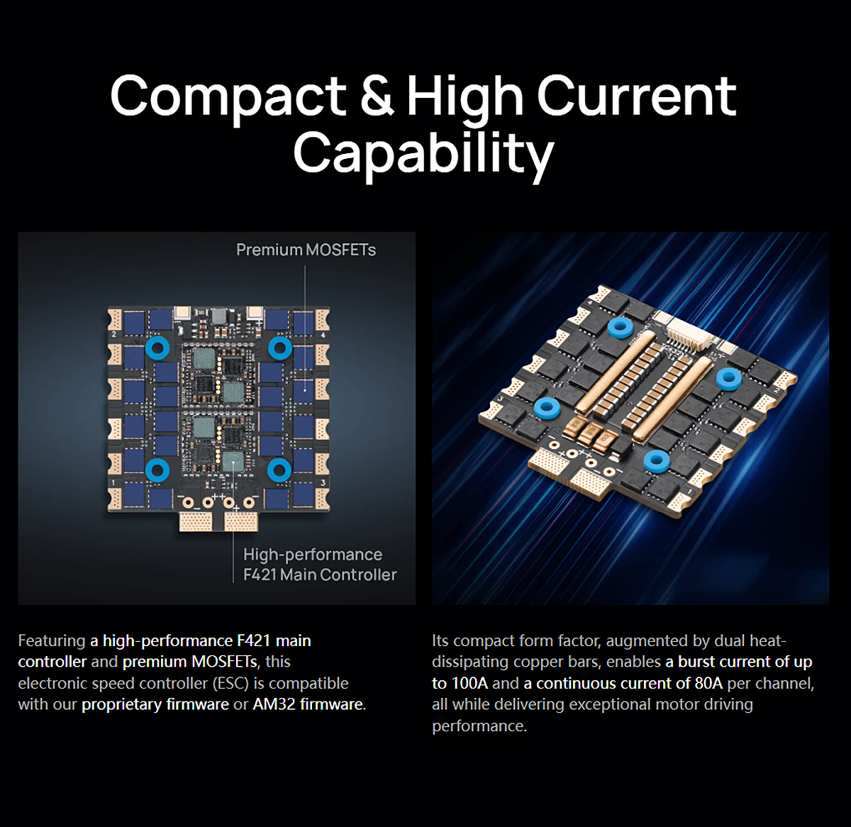 Featuring a high-performance F421 main controller and premium MOSFETs, this electronic speed controller (ESC) is compatible with our proprietary firmware or AM32 firmware.