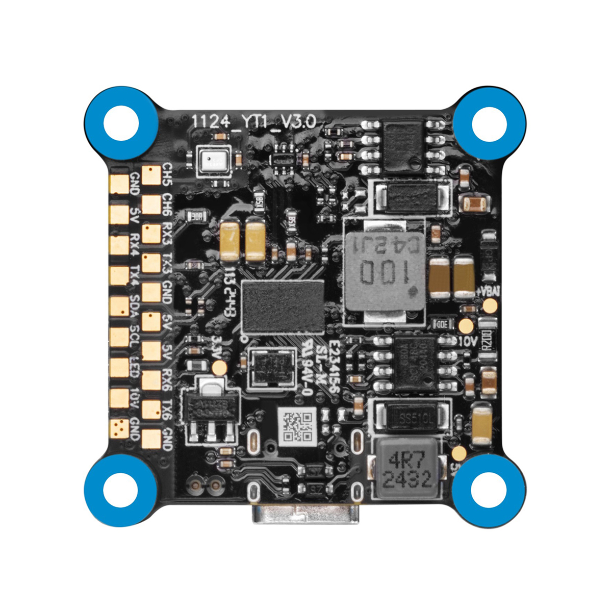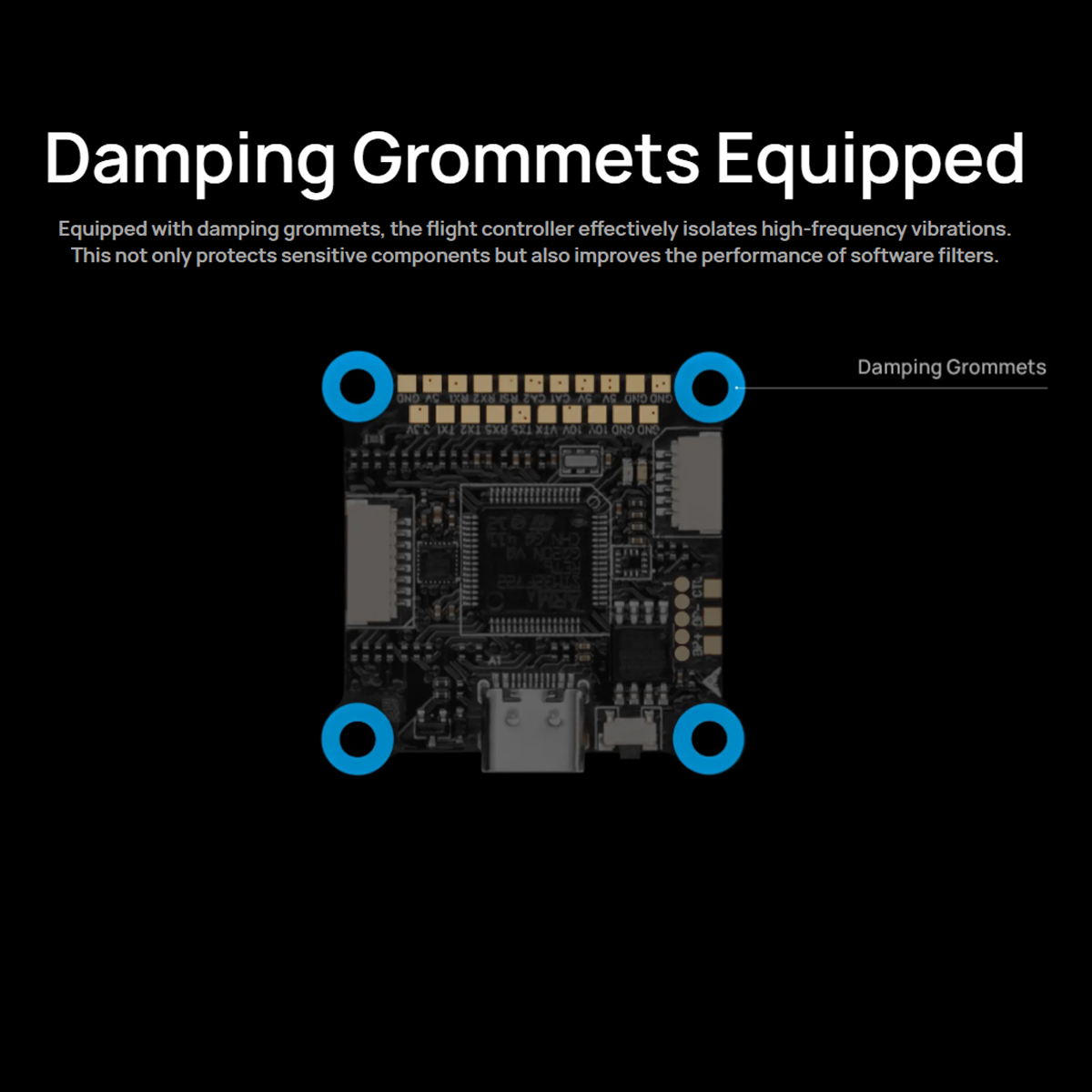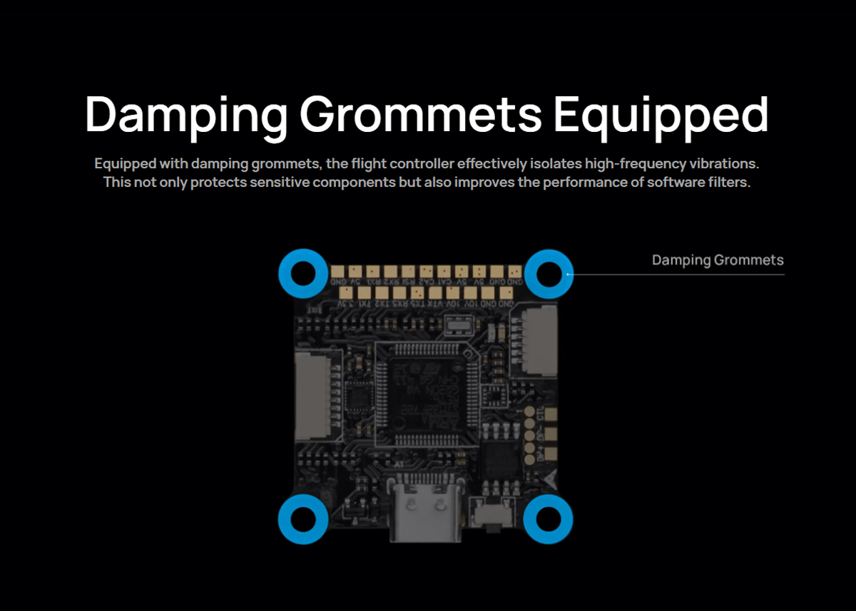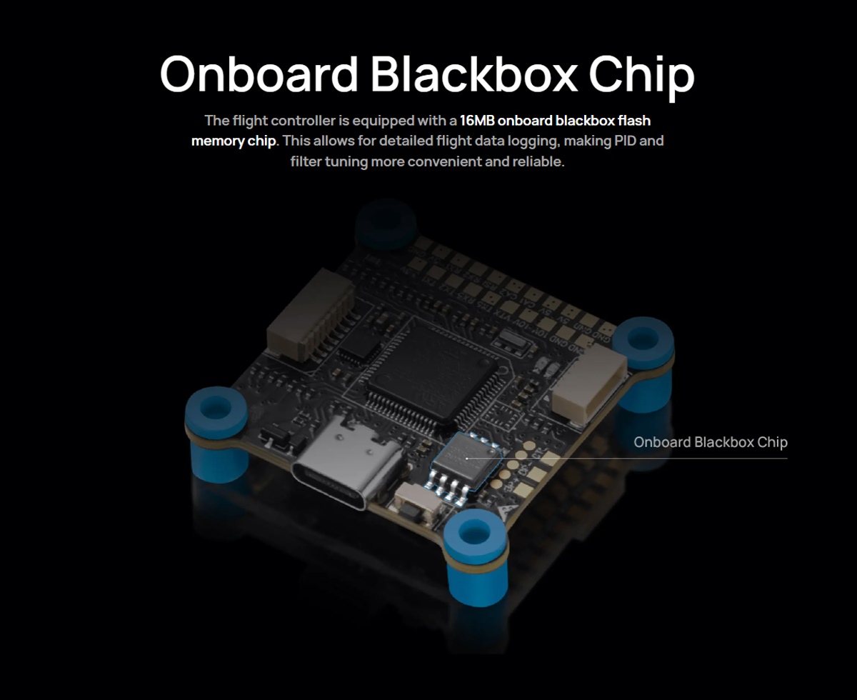 Onboard Blackbox Chip: The flight controller is equipped with a 16MB onboard blackbox flash memory chip. This allows for detailed flight data logging, making PID and filter tuning more convenient and reliable.