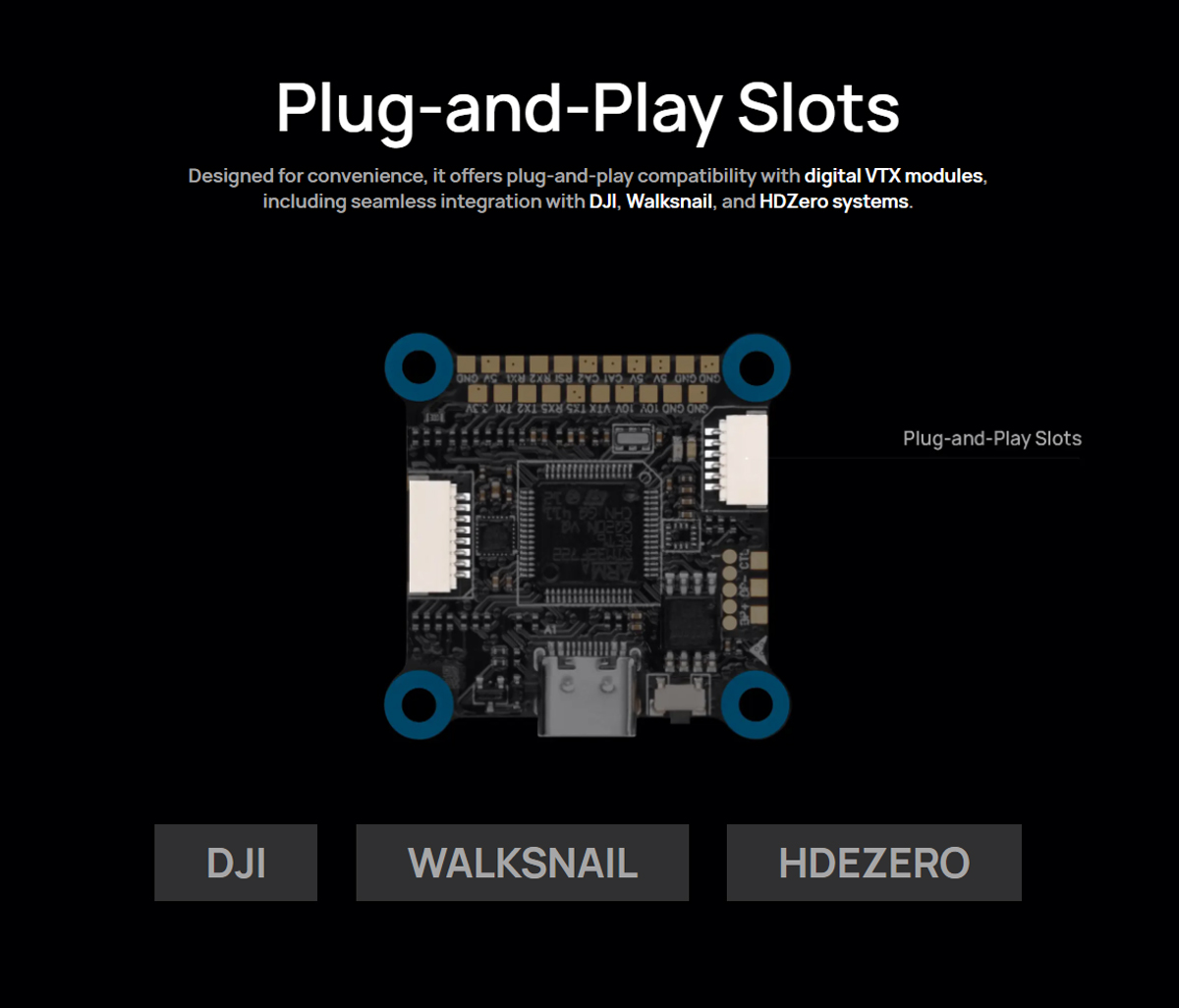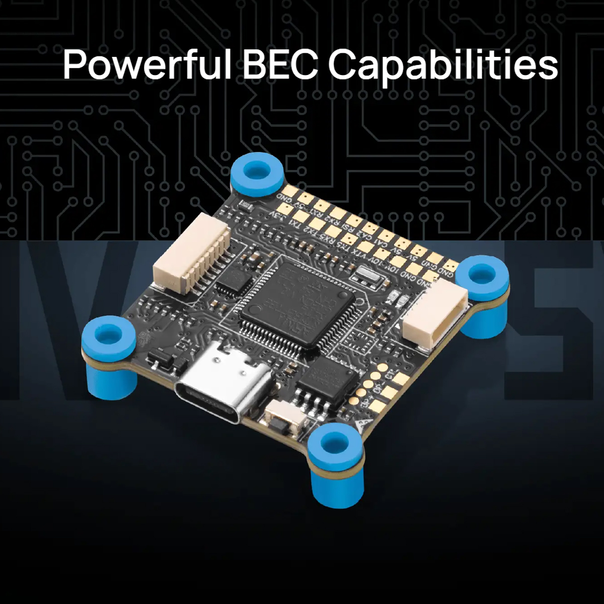 Powerful BEC Capabilities: The onboard battery eliminator circuit (BEC) offers dual voltage outputs of 10V and 5V, providing stable power for peripherals such as GPS, receivers,and VTX modules. High-power VTX modules can be powered directly from the battery input (BAT).