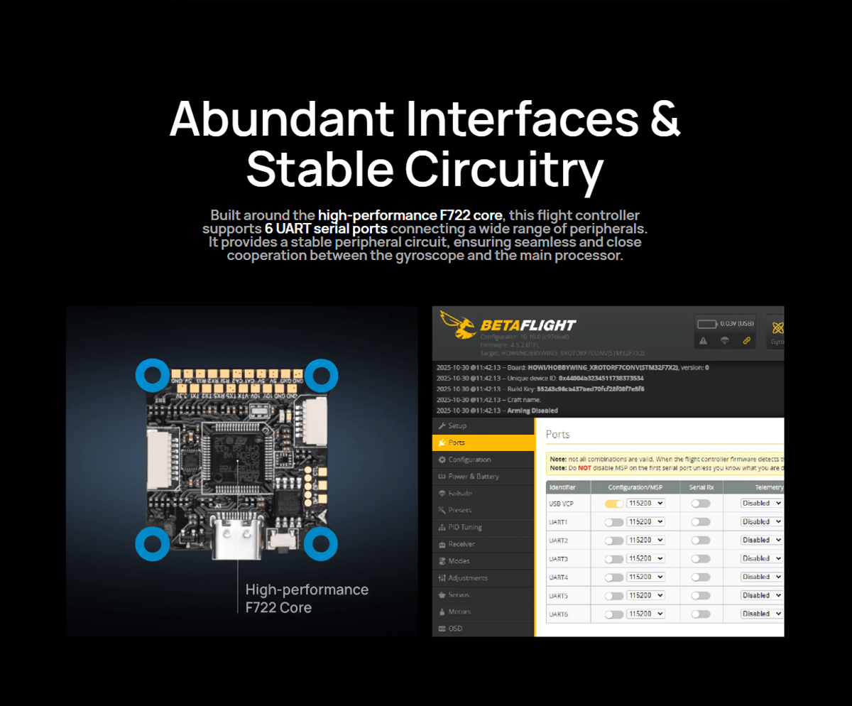 Abundant Interfaces & Stable Circuitry: Built around the high-performance F722 core, this flight controller supports 6 UART serial ports connecting a wide range of peripherals. It provides a stable peripheral circuit, ensuring seamless and close cooperation between the gyroscope and the main processor.