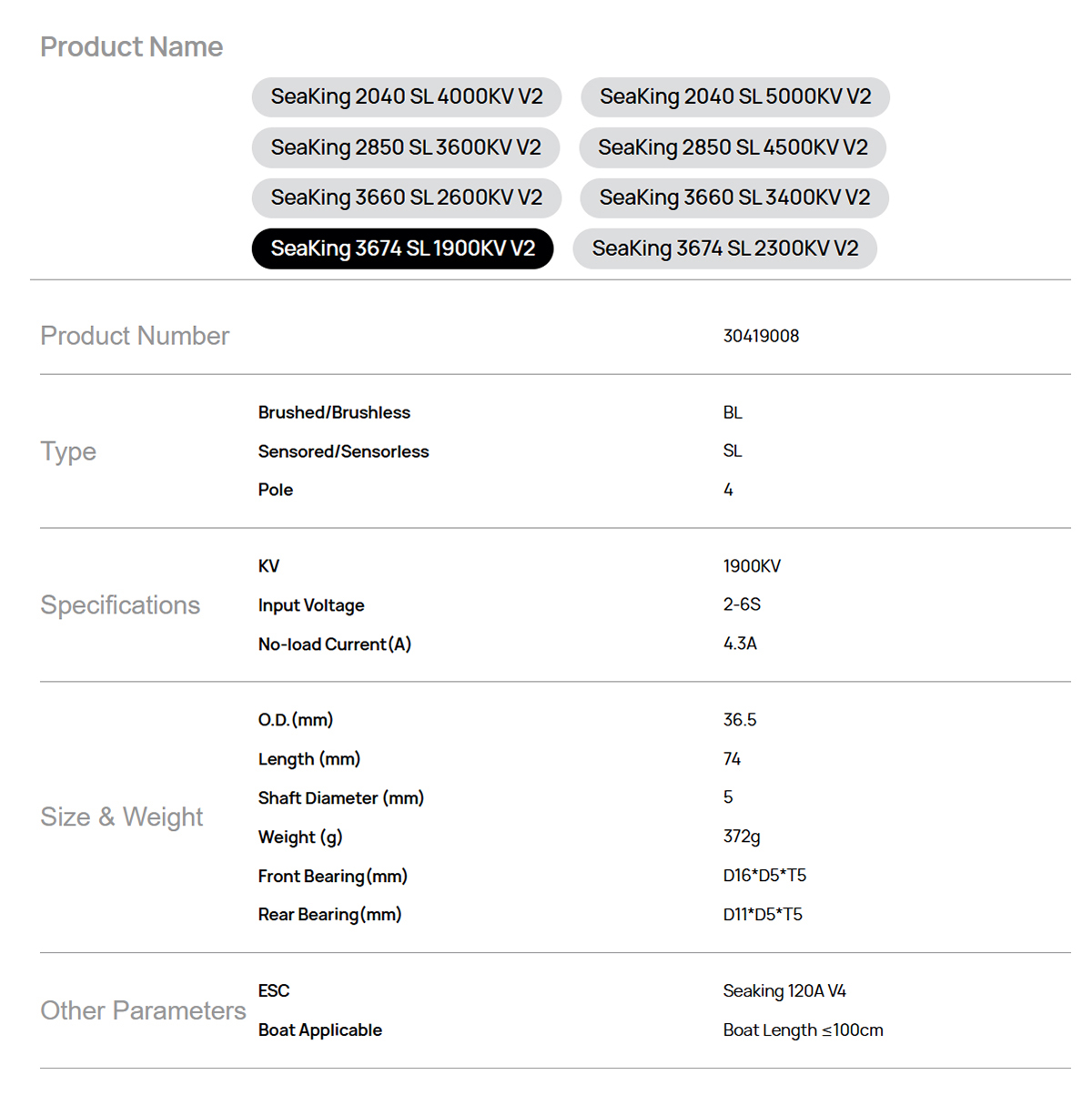 Model: SeaKing 3674 SL 1900KV V2