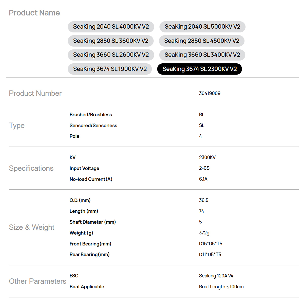 Model: SeaKing 3674 SL 2300KV V2