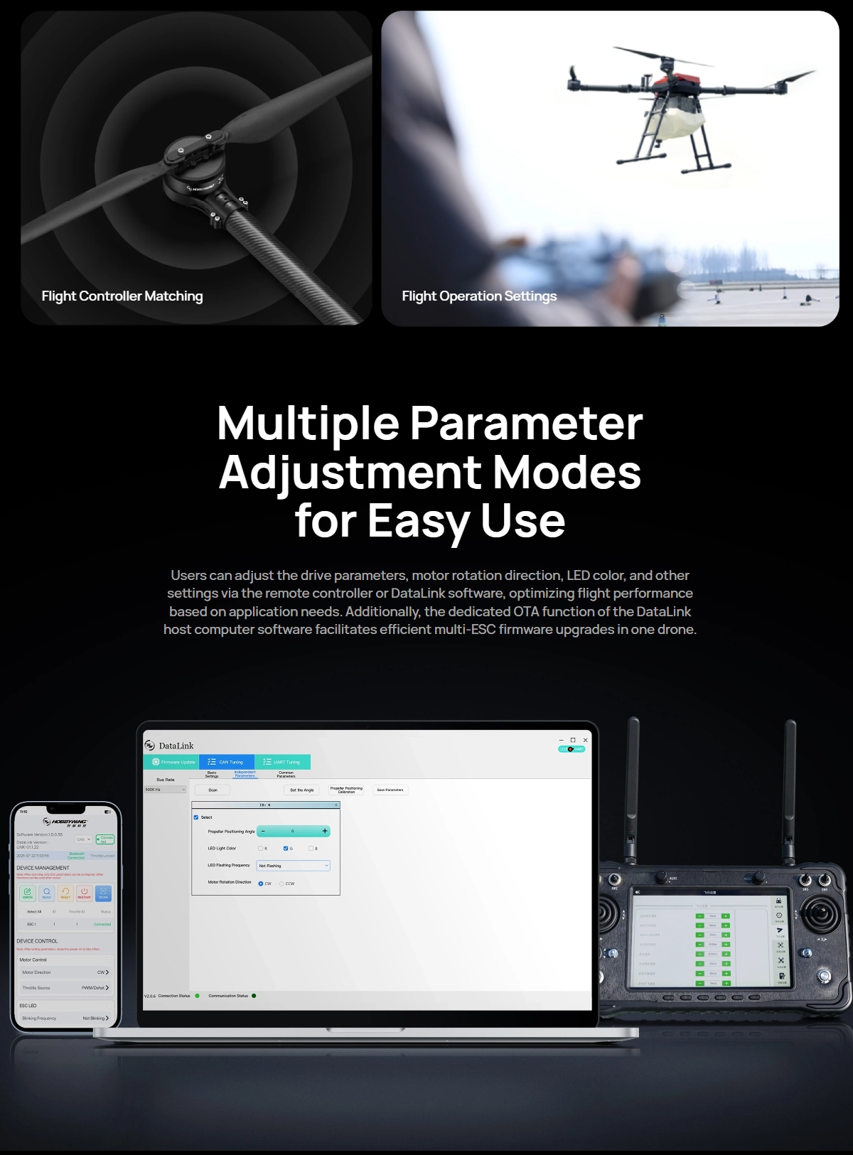 Easy Operation: Dual-mode parameter adjustment (remote control/software), OTA firmware upgrade, universal propeller adaptation;