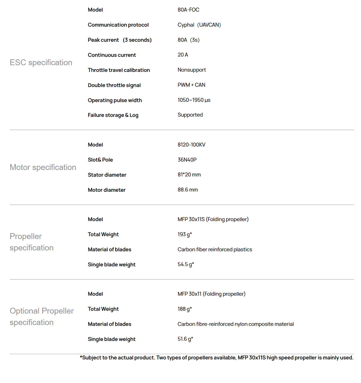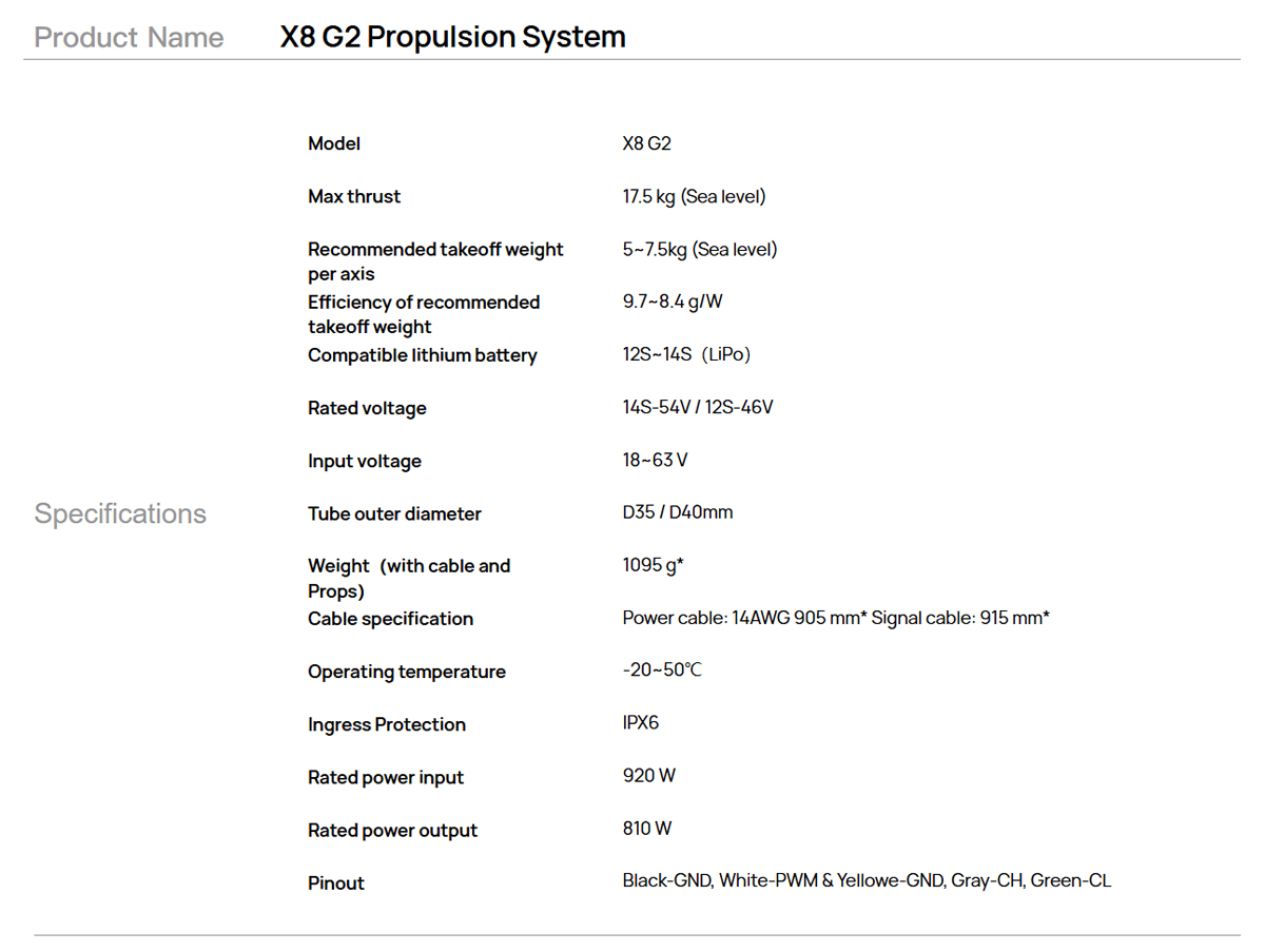 Recommended Takeoff Weight per Axis: 5~7.5 kg (Sea Level)