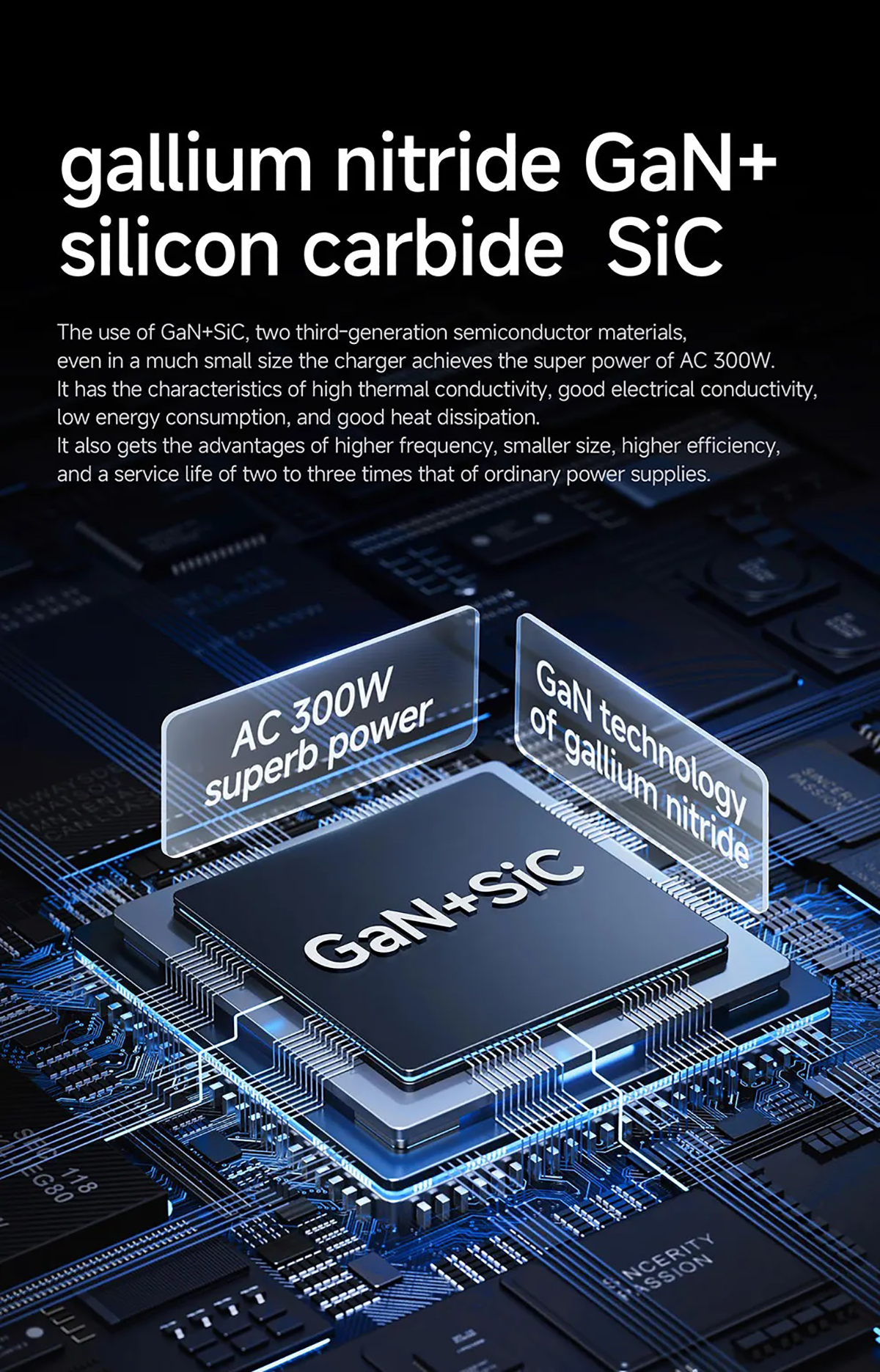 The use of GaN+SiC, two third-generation semiconductor materials,even in a much small size the charger achieves the super power of AC 300W.It has the characteristics of high thermal conductivity, good electrical conductivity,low energy consumption, and good heat dissipation.It also gets the advantages of higher frequency, smaller size, higher efficiency,and a service life of two to three times that of ordinary power supplies.
