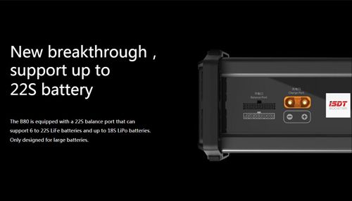 – The B80 is equipped with a 22S balance port that can,support 6 to 22S LiFe batteries and up to 18S LiPo batteries.Only designed for large batteries.