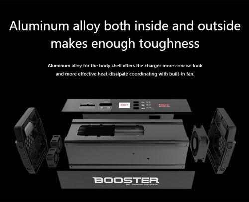 – Aluminum alloy for the body shell offers the charger more concise look and more effective heat-dissipate coordinating with built-in fan.