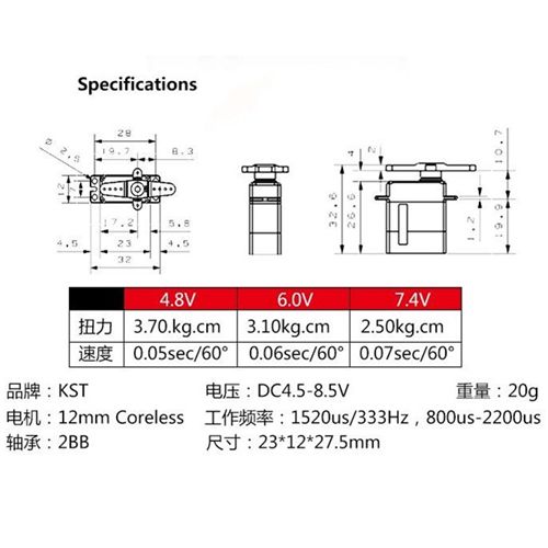 Torque: 3.10kg.cm @ 6.0V; 3.70kg.cm @ 7.4V