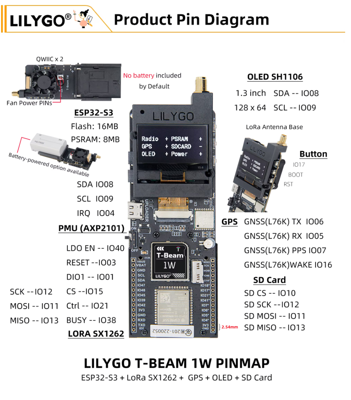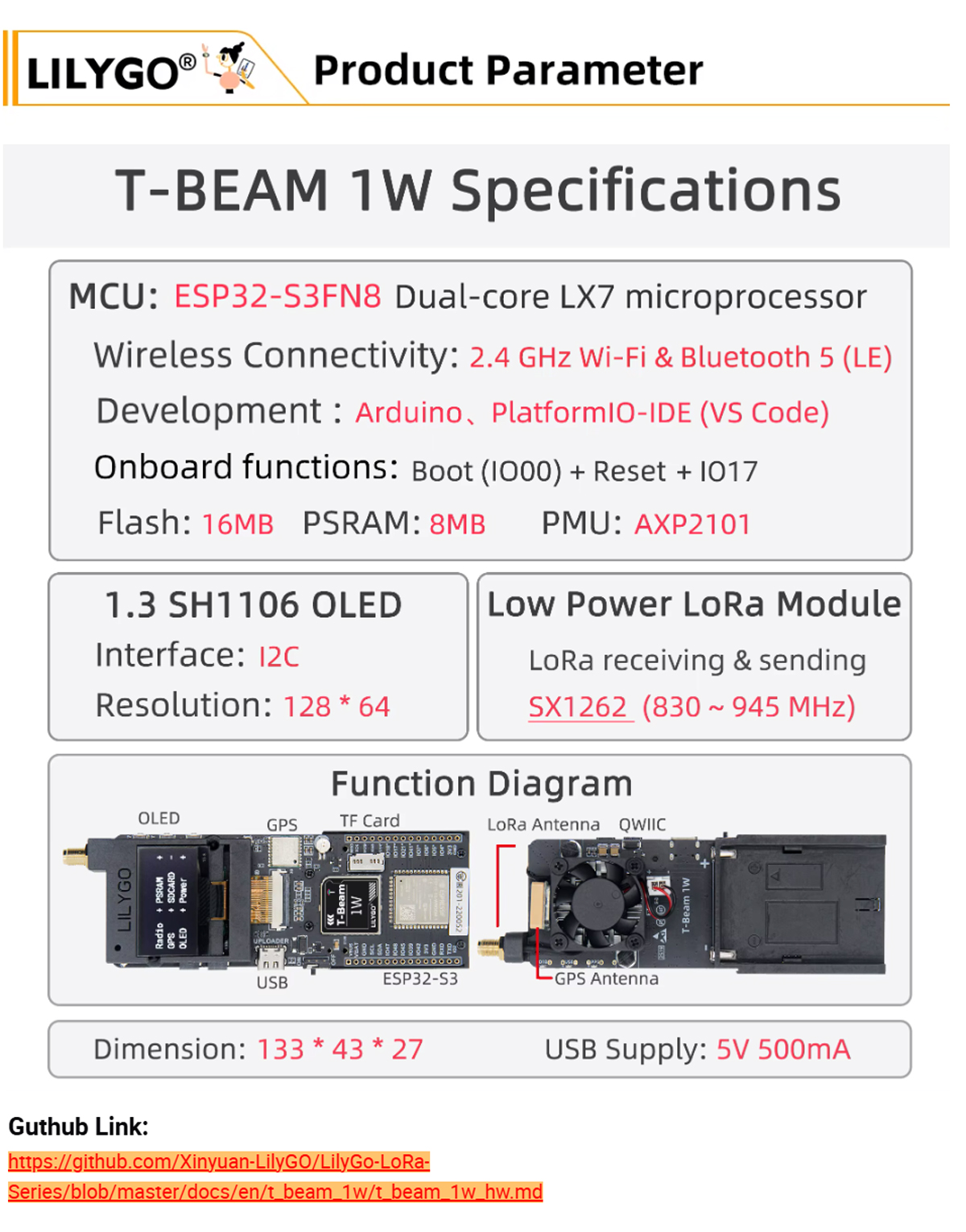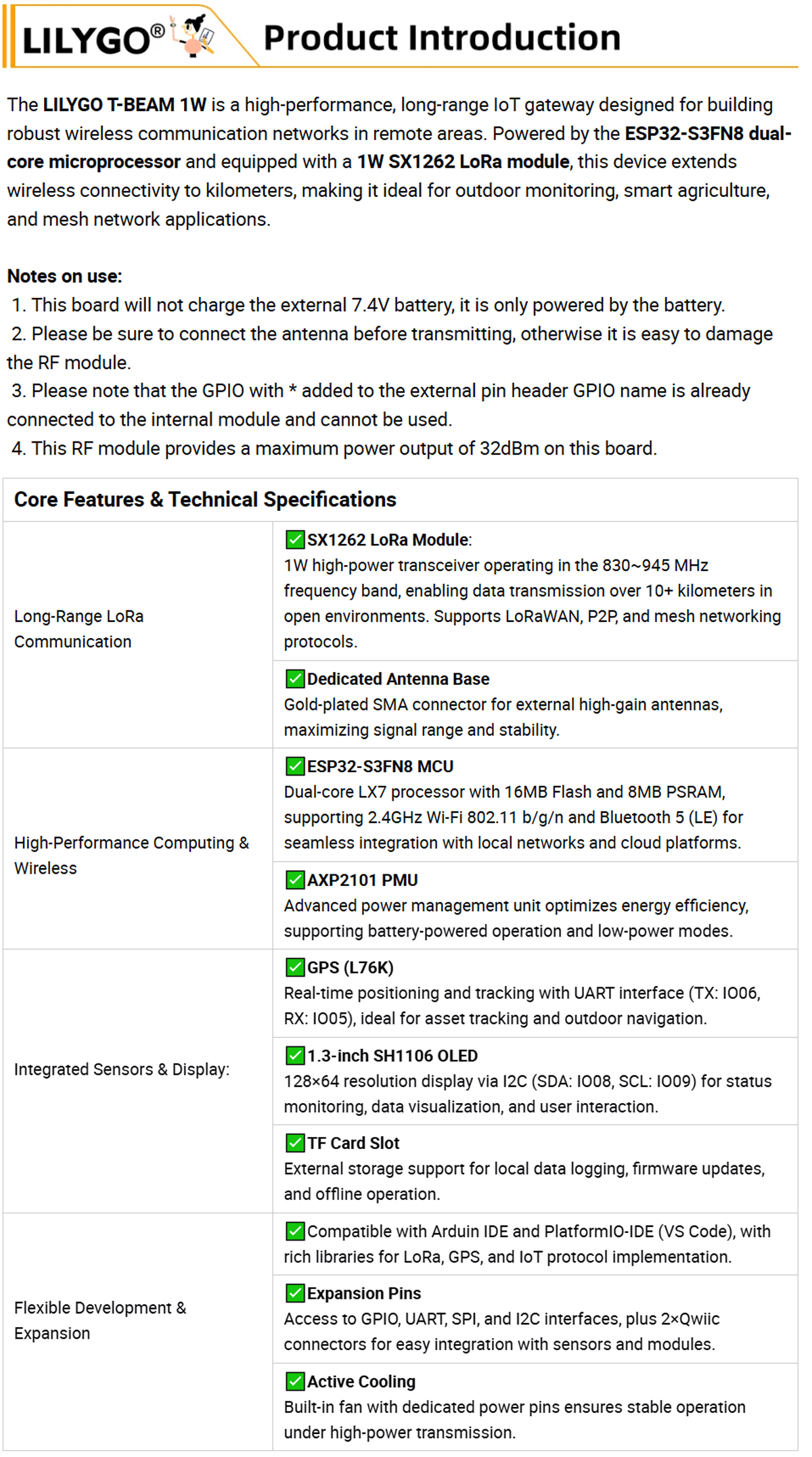 LILYGO T-BEAM 1W is a high-performance, long-range IoT gateway designed for building robust wireless communication networks in remote areas. Powered by the ESP32-S3FN8 dual-core microprocessor and equipped with a 1W SX1262 LoRa module, this device extends wireless connectivity to kilometers, making it ideal for outdoor monitoring, smart agriculture, and mesh network applications.