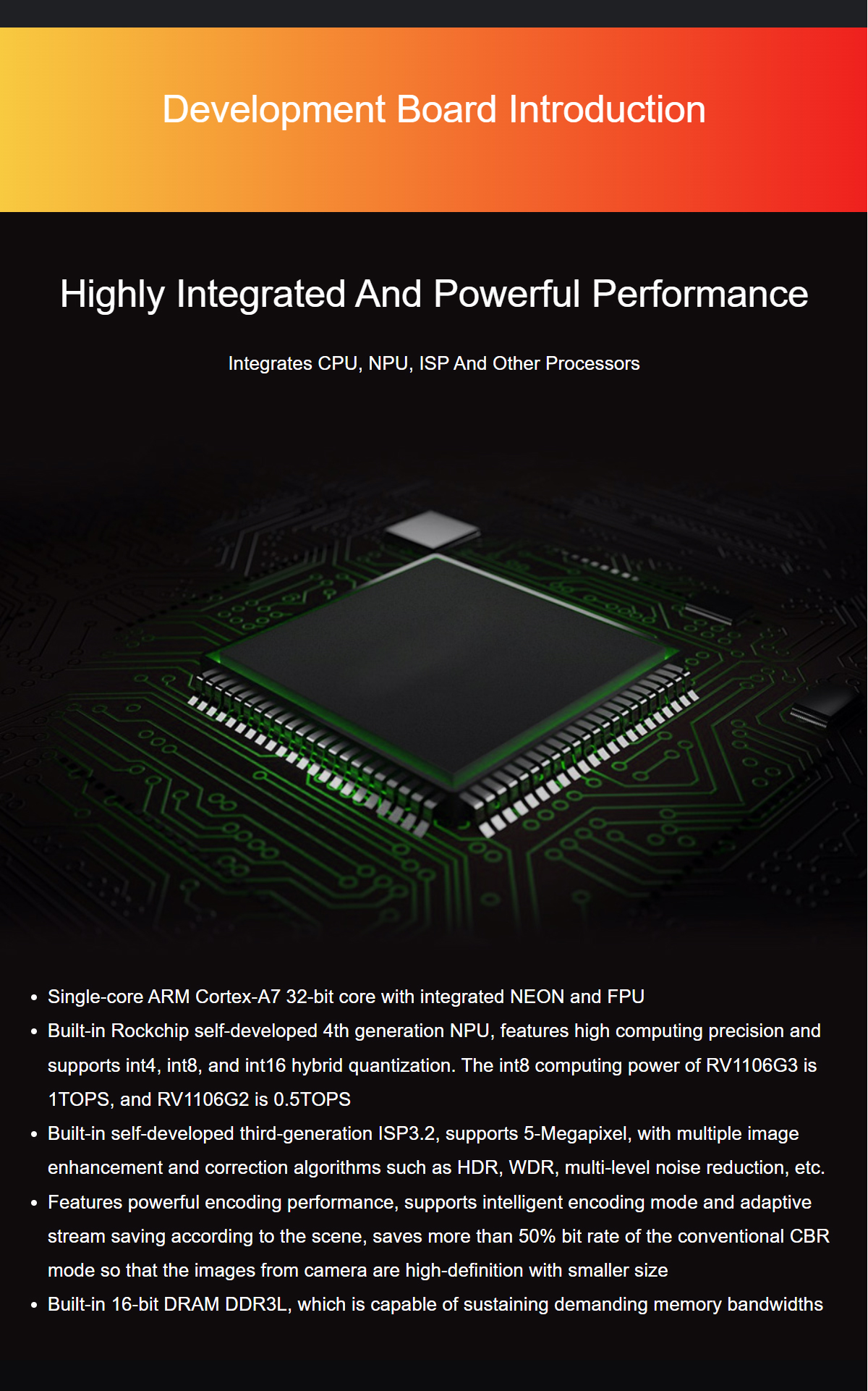 Built-in Rockchip self-developed 4th generation NPU, features high computing precision and supports int4, int8, and int16 hybrid quantization.